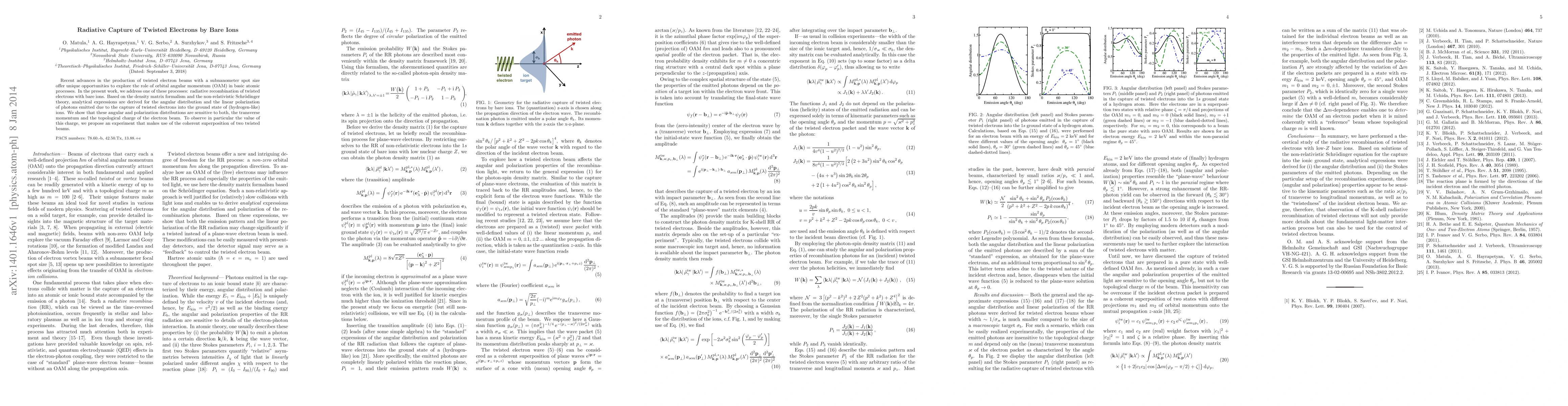 This paper explores the radiative recombination of twisted electron beams with bare ions, deriving analytical expressions for photon emission's angular distribution and polarization. The study reveals that these distributions are influenced by the electron beam's transverse momentum and topological charge, proposing an experiment to detect the latter using coherent superposition of twisted beams.