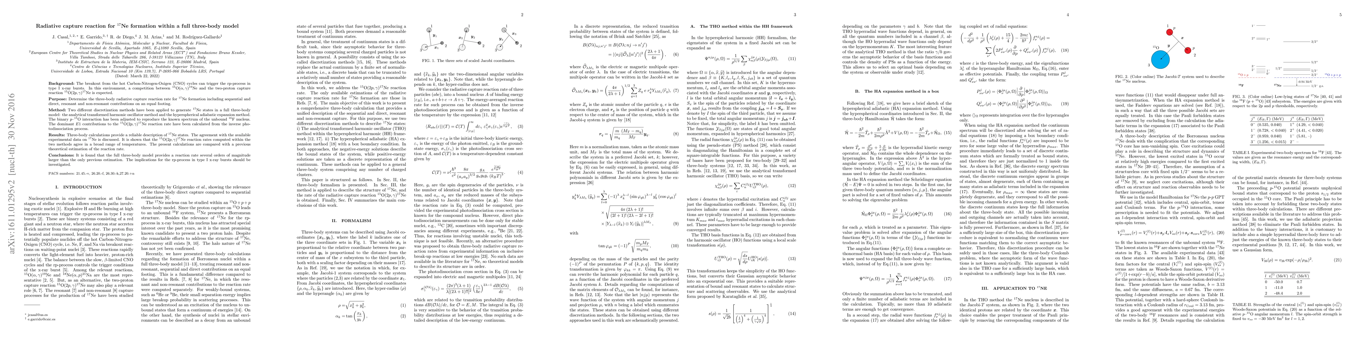 The research utilizes two different discretization methods: the analytical transformed harmonic oscillator (THO) method and the hyperspherical adiabatic expansion (HA) method to model the three-body system of $^{17}$Ne formation, including sequential and direct, resonant and non-resonant contributions.