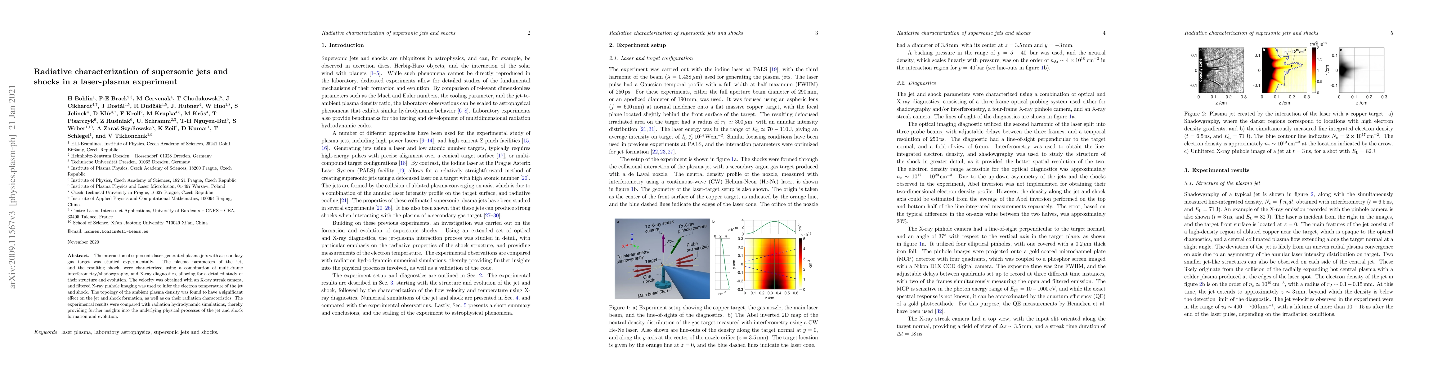 This paper investigates supersonic plasma jets and shocks generated by laser-plasma interactions using multi-frame interferometry, shadowgraphy, and X-ray diagnostics. The study reveals significant effects of ambient plasma density on jet and shock formation and radiation, with experimental results corroborated by radiation hydrodynamic simulations.