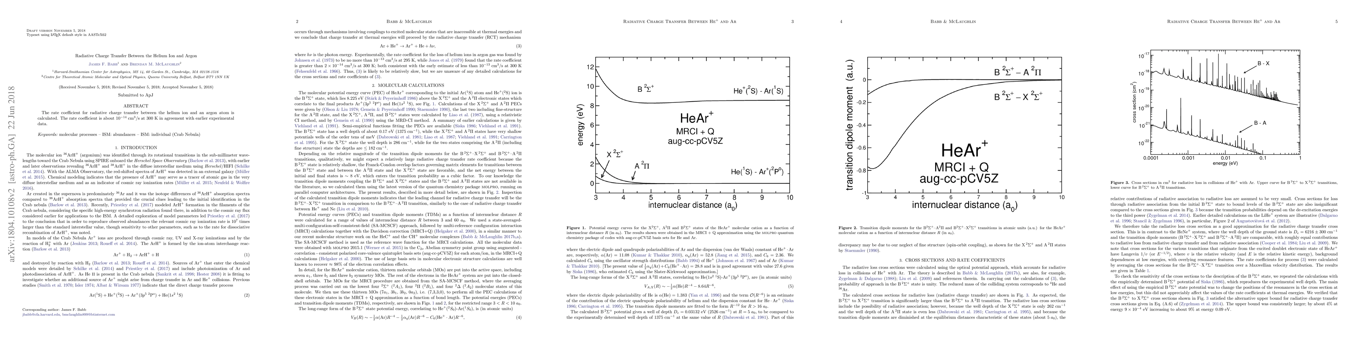 Researchers calculated the rate coefficient for radiative charge transfer between helium ions and argon atoms, finding it to be approximately $10^{-14}$ cm$^3$/s at 300 K, in agreement with earlier experimental data.
