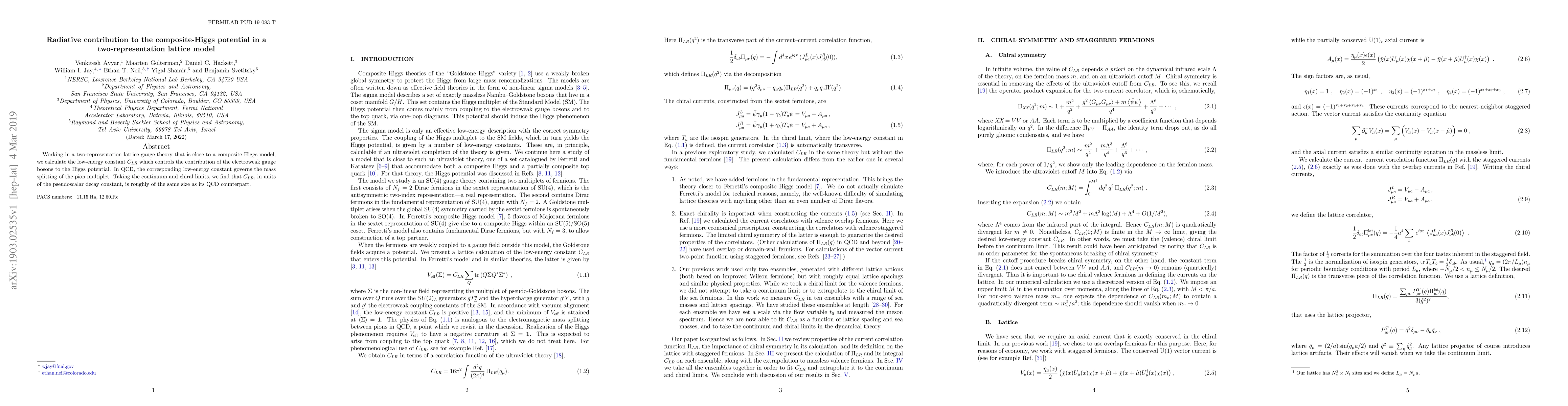 Working in a two-representation lattice gauge theory that is close to a composite Higgs model, we calculate the low-energy constant CLR which controls the contribution of the electroweak gauge bosons to the Higgs potential. In QCD, the corresponding low-energy constant governs the mass splitting of the pion multiplet. Taking the continuum and chiral limits, we find that CLR, in units of the pseudoscalar decay constant, is roughly of the same size as its QCD counterpart.