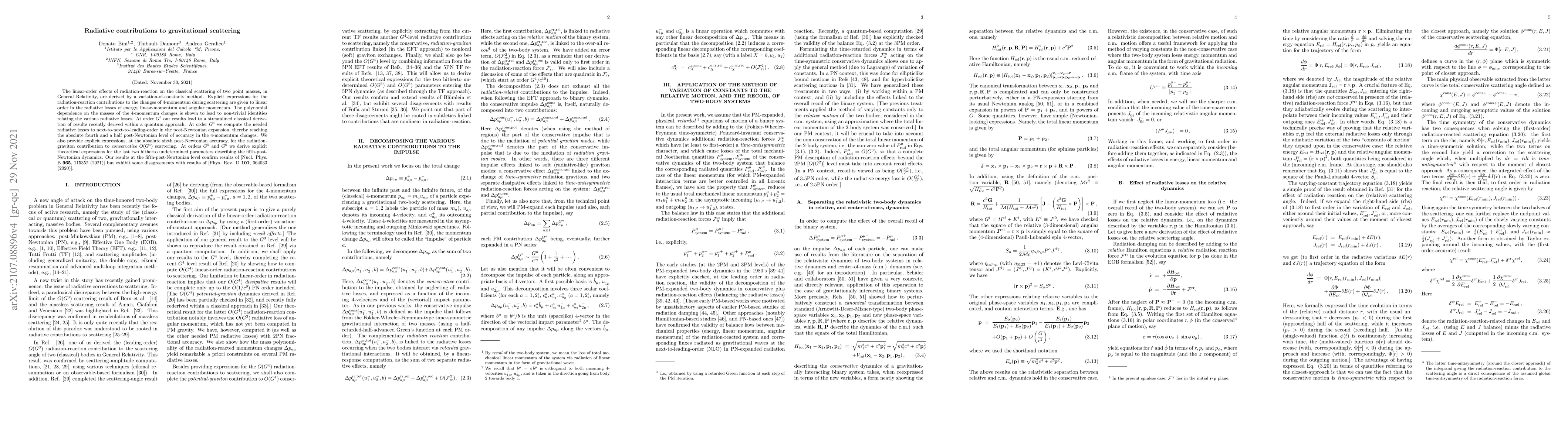 The linear-order effects of radiation-reaction on the classical scattering of two point masses, in General Relativity, are derived by a variation-of-constants method. Explicit expressions for the radiation-reaction contributions to the changes of 4-momentum during scattering are given to linear order in the radiative losses of energy, linear-momentum and angular momentum. The polynomial dependence on the masses of the 4-momentum changes is shown to lead to non-trivial identities relating the various radiative losses. At order $G^3$ our results lead to a streamlined classical derivation of results recently derived within a quantum approach. At order $G^4$ we compute the needed radiative losses to next-to-next-to-leading-order in the post-Newtonian expansion, thereby reaching the absolute fourth and a half post-Newtonian level of accuracy in the 4-momentum changes. We also provide explicit expressions, at the absolute sixth post-Newtonian accuracy, for the radiation-graviton contribution to {\it conservative} $O(G^4)$ scattering. At orders $G^5$ and $G^6$ we derive explicit theoretical expressions for the last two hitherto undetermined parameters describing the fifth-post-Newtonian dynamics. Our results at the fifth-post-Newtonian level confirm results of [Nucl. Phys. B \textbf{965}, 115352 (2021)] but exhibit some disagreements with results of [Phys. Rev. D \textbf{101}, 064033 (2020)].