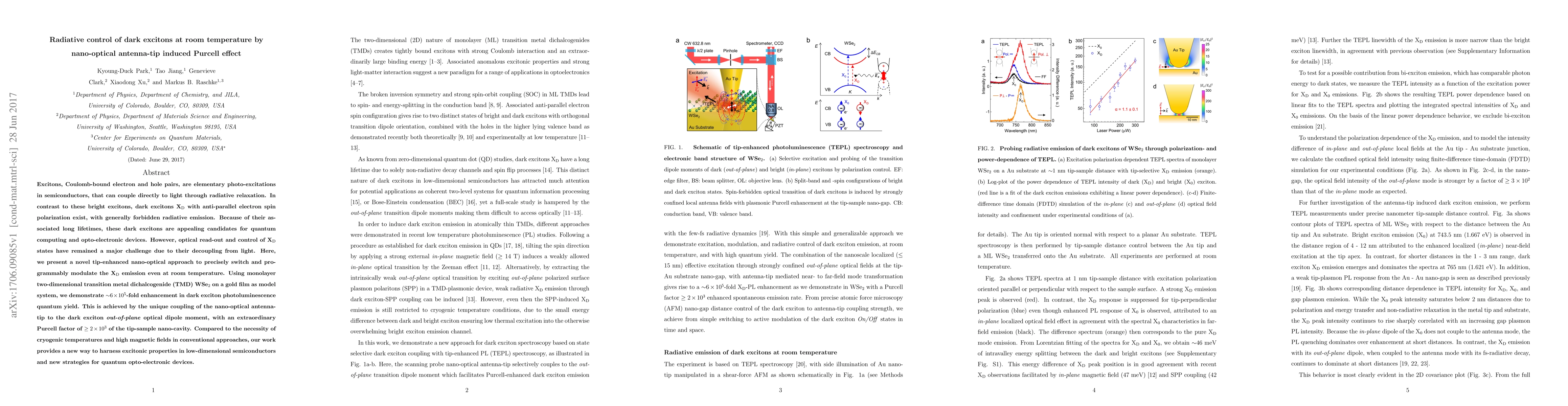 This paper presents a novel tip-enhanced nano-optical method to control dark excitons in WSe₂ at room temperature, achieving a 600,000-fold enhancement in photoluminescence quantum yield via the Purcell effect induced by a nano-optical antenna-tip. This approach enables optical readout and manipulation of dark excitons, offering new strategies for quantum opto-electronic devices.