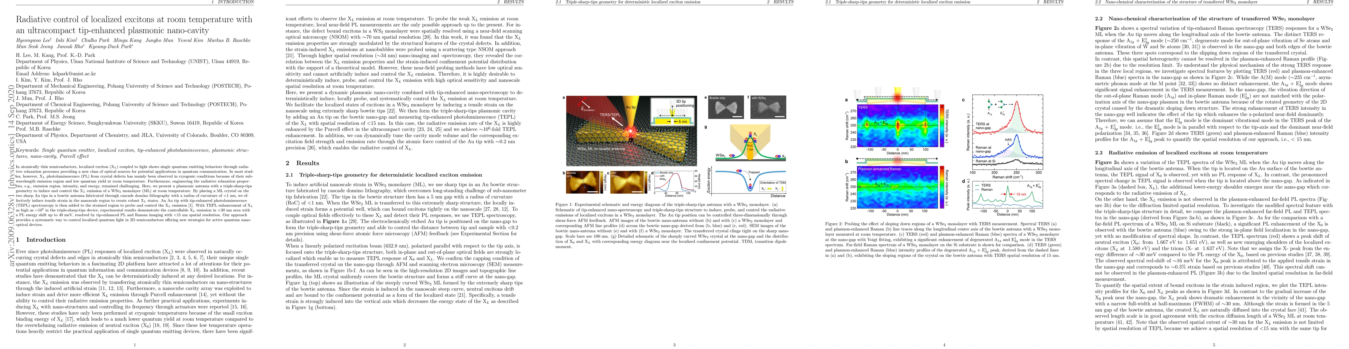 In atomically thin semiconductors, localized exciton (X$_L$) coupled to light shows single quantum emitting behaviors through radiative relaxation processes providing a new class of optical sources for potential applications in quantum communication. In most studies, however, X$_L$ photoluminescence (PL) from crystal defects has mainly been observed in cryogenic conditions because of their sub-wavelength emission region and low quantum yield at room temperature. Furthermore, engineering the radiative relaxation properties, e.g., emission region, intensity, and energy, remained challenging. Here, we present a plasmonic antenna with a triple-sharp-tips geometry to induce and control the X$_L$ emission of a WSe$_2$ monolayer (ML) at room temperature. By placing a ML crystal on the two sharp Au tips in a bowtie antenna fabricated through cascade domino lithography with a radius of curvature of <1 nm, we effectively induce tensile strain in the nanoscale region to create robust X$_L$ states. An Au tip with tip-enhanced photoluminescence (TEPL) spectroscopy is then added to the strained region to probe and control the X$_L$ emission. With TEPL enhancement of X$_L$ as high as ~10$^6$ in the triple-sharp-tips device, experimental results demonstrate the controllable X$_L$ emission in <30 nm area with a PL energy shift up to 40 meV, resolved by tip-enhanced PL and Raman imaging with <15 nm spatial resolution. Our approach provides a systematic way to control localized quantum light in 2D semiconductors offering new strategies for active quantum nano-optical devices.
