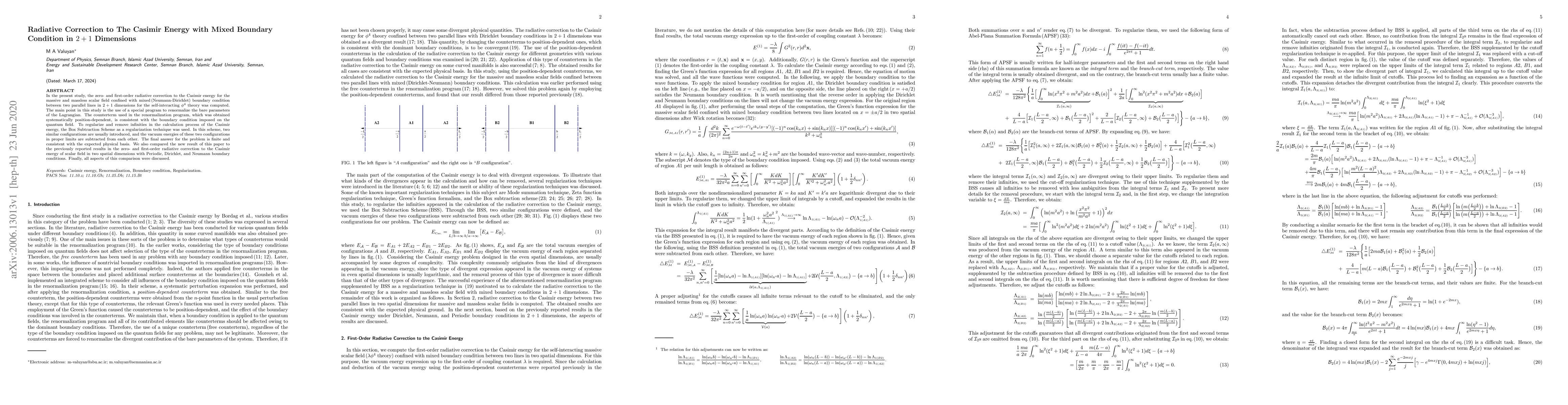 In the present study, the zero- and first-order radiative correction to the Casimir energy for the massive and massless scalar field confined with mixed (Neumann-Dirichlet) boundary condition between two parallel lines in 2+1 dimensions for the self-interacting $\phi^4$ theory was computed. The main point in this study is the use of a special program to renormalize the bare parameters of the Lagrangian. The counterterm used in the renormalization program, which was obtained systematically position-dependent, is consistent with the boundary condition imposed on the quantum field. To regularize and remove infinities in the calculation process of the Casimir energy, the Box Subtraction Scheme as a regularization technique was used. In this scheme, two similar configurations are usually introduced, and the vacuum energies of these two configurations in proper limits are subtracted from each other. The final answer for the problem is finite and consistent with the expected physical basis. We also compared the new result of this paper to the previously reported results in the zero- and first-order radiative correction to the Casimir energy of scalar field in two spatial dimensions with Periodic, Dirichlet, and Neumann boundary conditions. Finally, all aspects of this comparison were discussed.