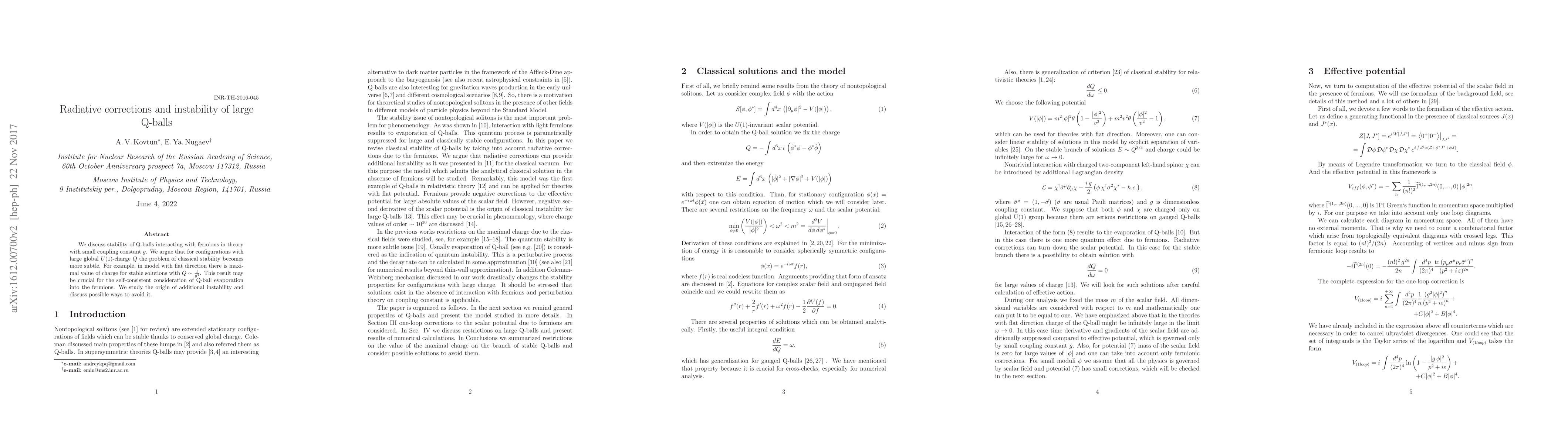 We discuss stability of Q-balls interacting with fermions in theory with small coupling constant g. We argue that for configurations with large global U(1)-charge Q the problem of classical stability becomes more subtle. For example, in model with flat direction there is maximal value of charge for stable solutions with Q~1/g^4. We study origin of additional instability and discuss possible ways to avoid it.