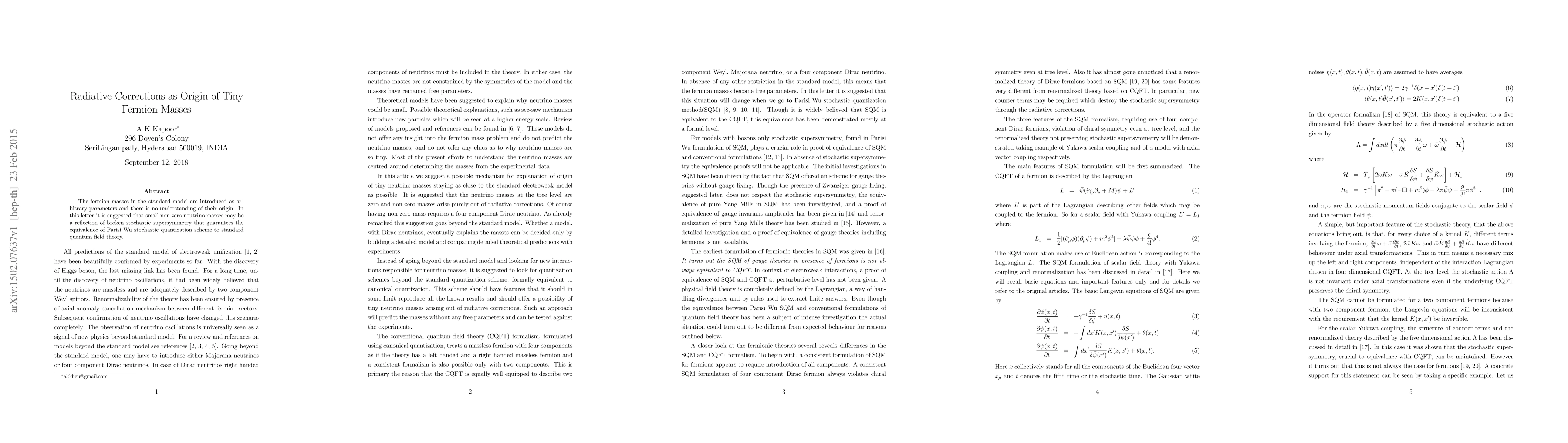 The fermion masses in the standard model are introduced as arbitrary parameters and there is no understanding of their origin. In this letter it is suggested that small non zero neutrino masses may be a reflection of broken stochastic supersymmetry that guarantees the equivalence of Parisi Wu stochastic quantization scheme to standard quantum field theory.