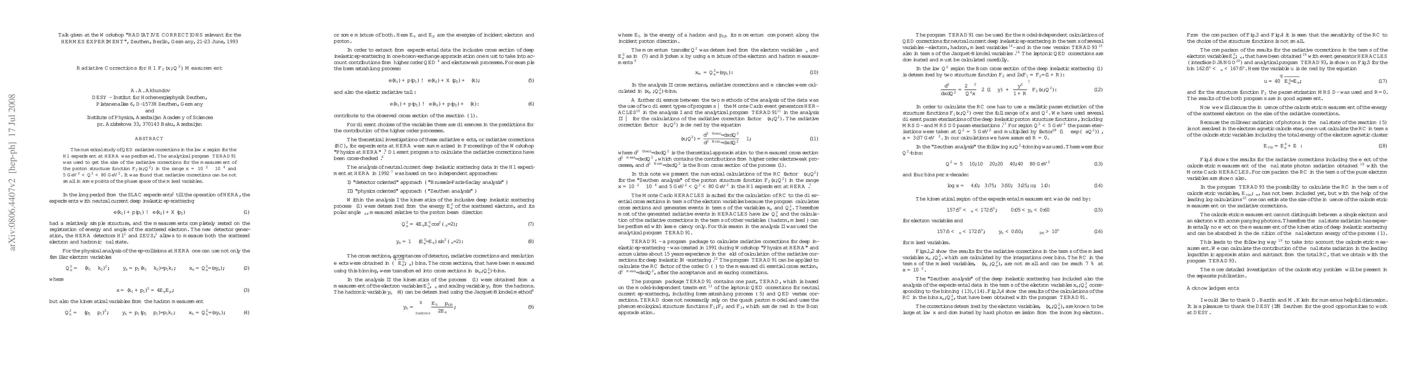 The numerical study of QED radiative corrections in the low $x$ region for the H1 experiment at HERA was performed. The analytical program TERAD91 was used to get the size of the radiative corrections for the measurement of the proton structure function $F_2(x,Q^2)$ in the range $x= 10^{-2} - 10^{-4}$ and $ 5 GeV^2 < Q^2 < 80 GeV^2$. It was found that radiative corrections can be not small in some points of the phase space of the mixed variables.