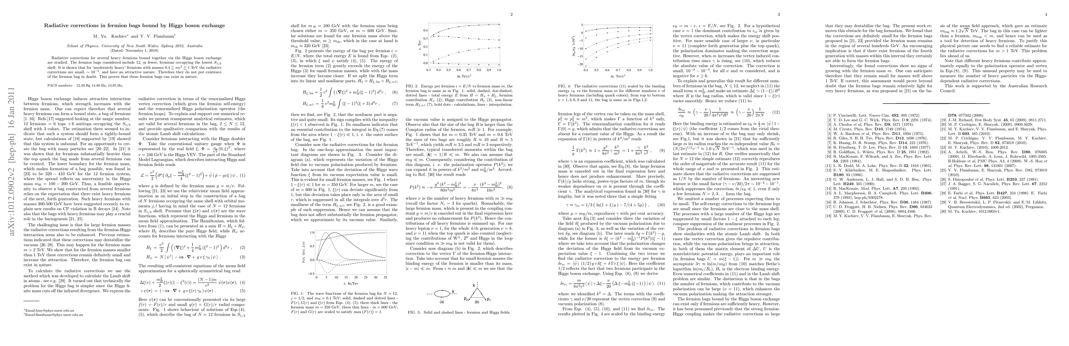 Radiative corrections for several heavy fermions bound together via the Higgs boson exchange are studied. The fermion bags considered include 12, or fewer, fermions occupying the lowest S_{1/2} shell. It is shown that for `moderately heavy' fermions with masses 0.4< m c^2< 1 TeV the radiative corrections are small, 10^{-2}, and have an attractive nature. Therefore they do not put existence of the fermion bag in doubt. This proves that these fermion bags can exist in nature.
