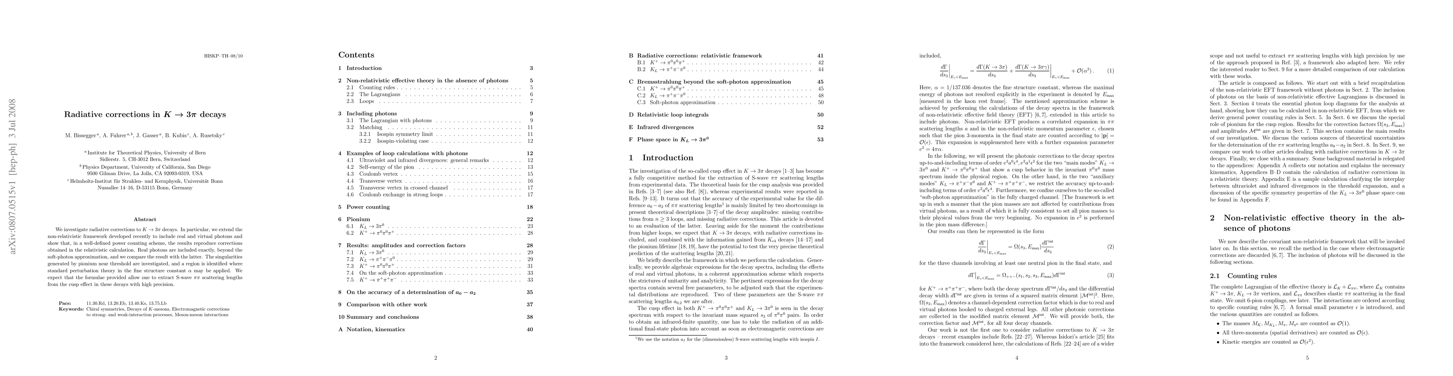 This paper investigates radiative corrections in K --> 3 pi decays, extending a non-relativistic framework to include real and virtual photons. It demonstrates that the results match those from relativistic calculations and identifies a region where standard perturbation theory can be applied, enabling precise extraction of S-wave pi pi scattering lengths.