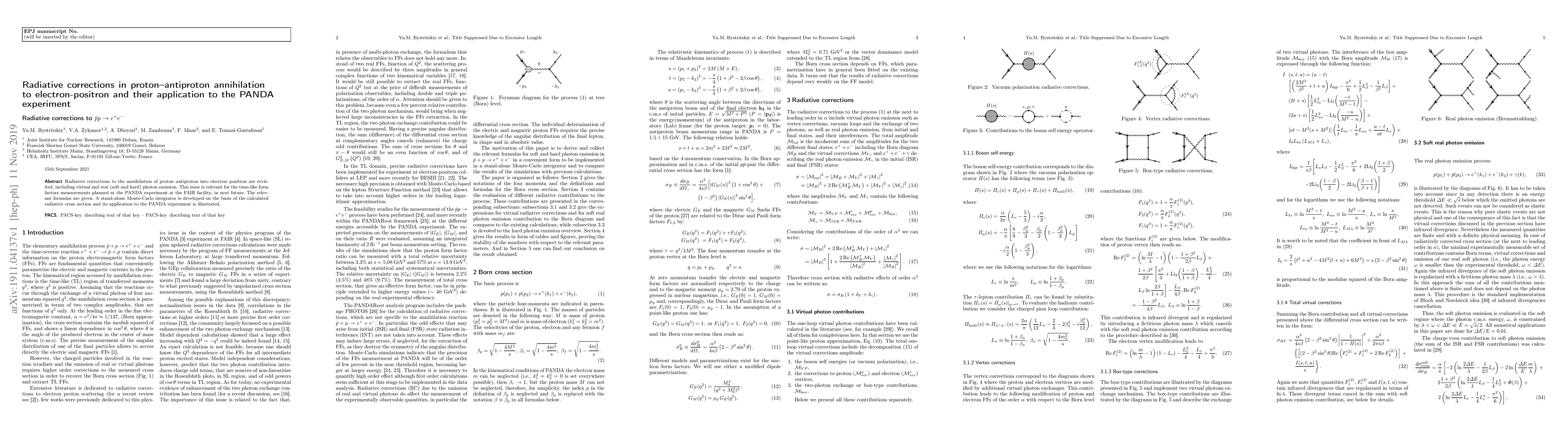 This paper revisits radiative corrections for proton-antiproton annihilation into electron-positron pairs, considering both virtual and real photon emissions. It provides formulas and a Monte-Carlo integrator for these corrections, which are crucial for the PANDA experiment at FAIR to accurately measure time-like form factors.