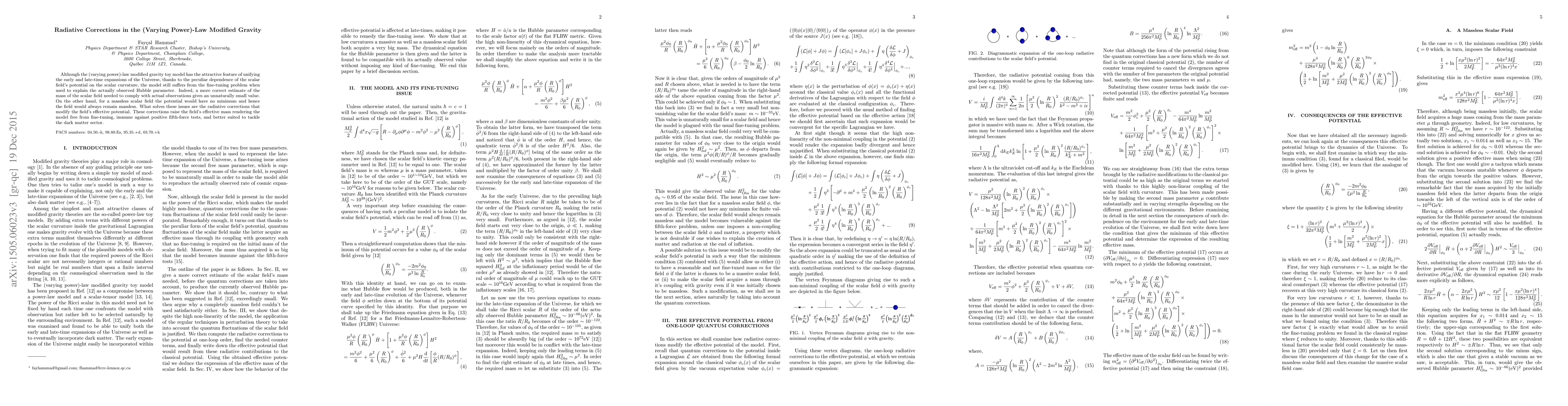 Although the (varying power)-law modified gravity toy model has the attractive feature of unifying the early and late-time expansions of the Universe, thanks to the peculiar dependence of the scalar field's potential on the scalar curvature, the model still suffers from the fine-tuning problem when used to explain the actually observed Hubble parameter. Indeed, a more correct estimate of the mass of the scalar field needed to comply with actual observations gives an unnaturally small value. On the other hand, for a massless scalar field the potential would have no minimum and hence the field would always remain massless. What solves these issues are the radiative corrections that modify the field's effective potential. These corrections raise the field's effective mass rendering the model free from fine-tuning, immune against positive fifth-force tests, and better suited to tackle the dark matter sector.