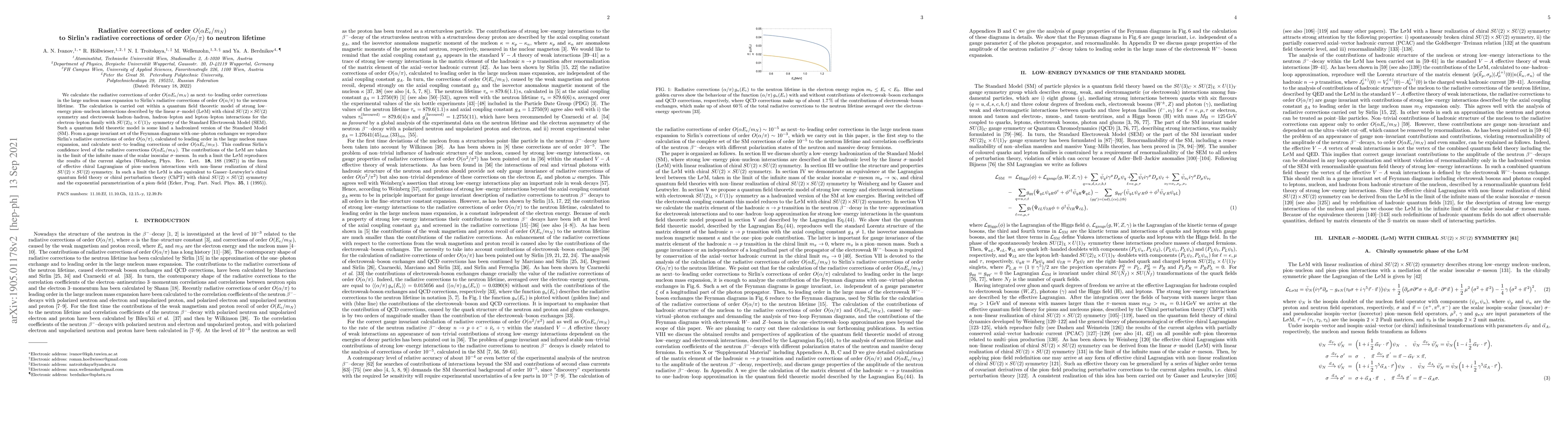 We calculate the radiative corrections of order O(alpha E_e/m_N) as next-to-leading order corrections in the large nucleon mass expansion to Sirlin's radiative corrections of order O(alpha/pi) to the neutron lifetime. The calculation is carried out within a quantum field theoretic model of strong low-energy pion--nucleon interactions described by the linear sigma-model (LsM) with chiral SU(2)xSU(2) symmetry and electroweak hadron-hadron, hadron-lepton and lepton-lepton interactions for the electron-lepton family with SU(2)_L x U(1)_Y symmetry of the Standard Electroweak Model (SEM). Such a quantum field theoretic model is some kind a hadronized version of the Standard Model (SM). From a gauge invariant set of the Feynman diagrams with one-photon exchanges we reproduce Sirlin's radiative corrections of order O(alpha/pi), calculated to leading order in the large nucleon mass expansion, and calculate next-to-leading corrections of order O(alpha E_e/m_N). This confirms Sirlin's confidence level of the radiative corrections O(alpha E_e/m_N). The contributions of the LsM are taken in the limit of the infinite mass of the scalar isoscalar sigma-meson. In such a limit the LsM reproduces the results of the current algebra (Weinberg, Phys. Rev. Lett. {\bf 18}, 188 (1967)) in the form of effective chiral Lagrangians of pion-nucleon interactions with non--linear realization of chiral SU(2)xSU(2) symmetry. In such a limit the L$\sigma$M is also equivalent to Gasser-Leutwyler's chiral quantum field theory or chiral perturbation theory (ChPT) with chiral SU(2)xSU(2)symmetry and the exponential parametrization of a pion-field (Ecker, Prog. Part. Nucl. Phys. {\bf 35}, 1 (1995)).
