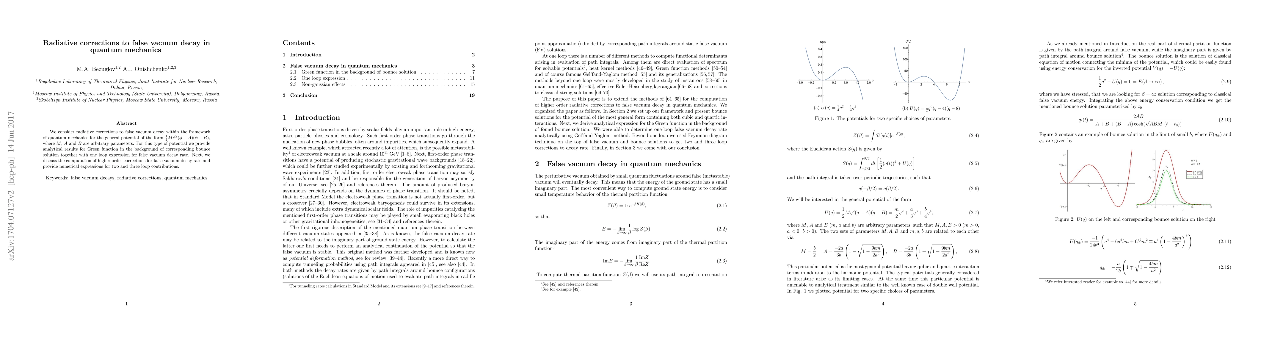 This paper investigates radiative corrections to false vacuum decay in quantum mechanics for a specific potential form. It provides analytical results for the Green function and one-loop expression for the decay rate, followed by numerical expressions for two and three-loop contributions to the decay rate.