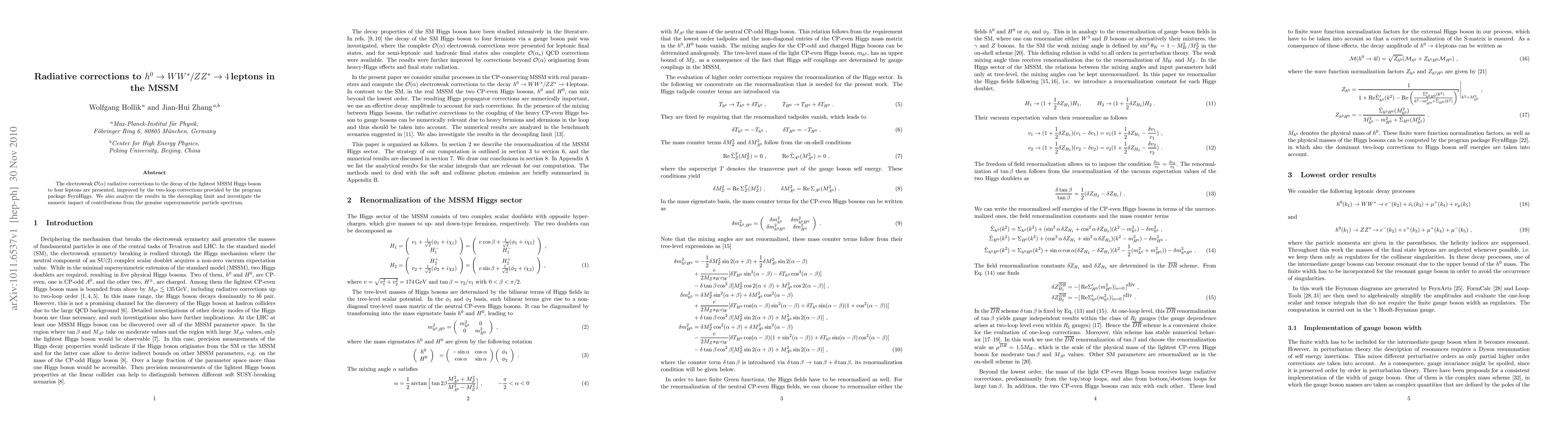 The electroweak $\mc O(\alpha)$ radiative corrections to the decay of the lightest MSSM Higgs boson to four leptons are presented, improved by the two-loop corrections provided by the program package FeynHiggs. We also analyze the results in the decoupling limit and investigate the numeric impact of contributions from the genuine supersymmetric particle spectrum.