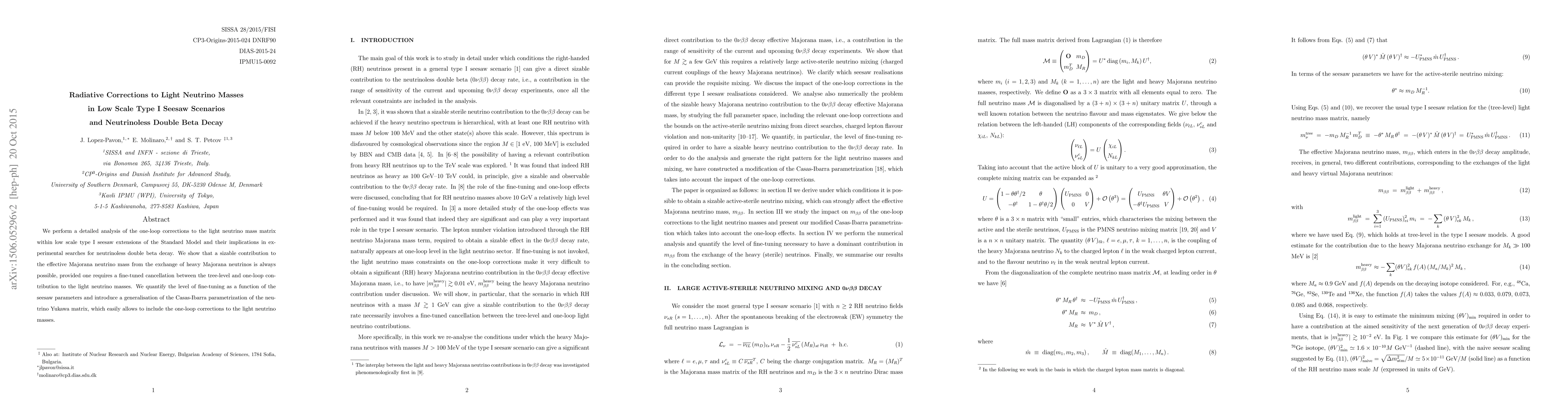 This paper analyzes one-loop corrections to light neutrino masses in low scale type I seesaw models, showing that significant contributions to neutrinoless double beta decay can arise from heavy Majorana neutrino exchanges, contingent on fine-tuned cancellations between tree-level and one-loop contributions. The study introduces a generalized parametrization to include these corrections.