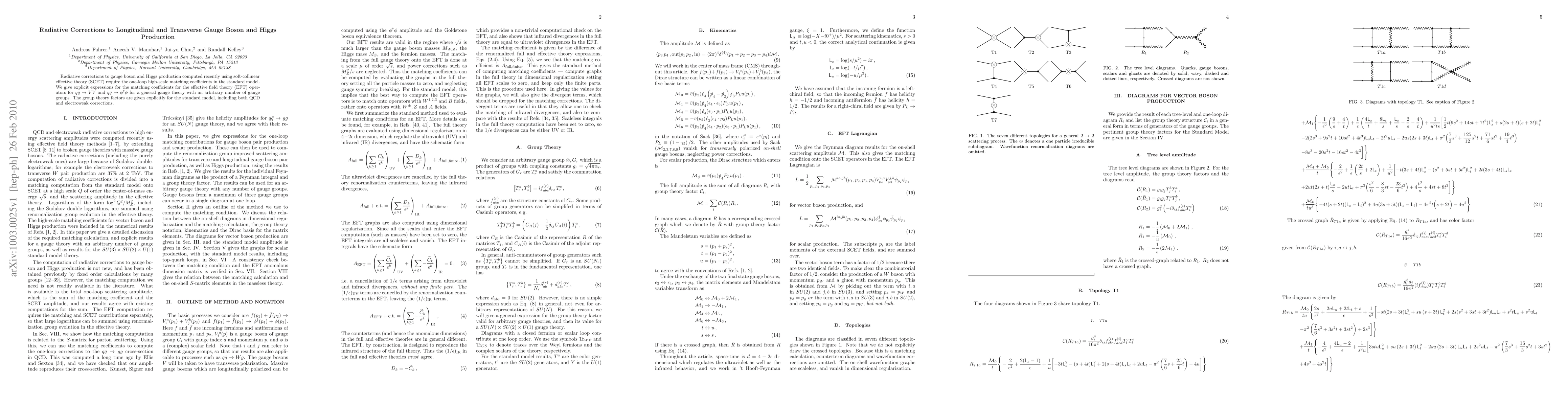 This paper provides explicit expressions for one-loop high-scale matching coefficients in the standard model using soft-collinear effective theory (SCET) for radiative corrections in gauge boson and Higgs production processes, including QCD and electroweak corrections. The group theory factors are explicitly detailed for both q qbar -> VV and q qbar -> phi^+ phi interactions.