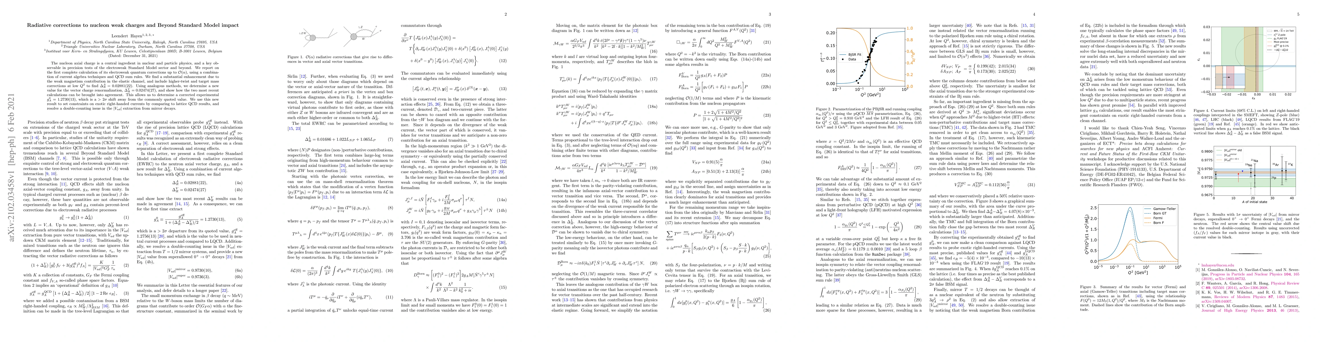 This research calculates nucleon axial charge radiative corrections up to $mathcal{O}(alpha)$, finding a significant enhancement from weak magnetism. It also determines a new value for the vector charge reconciling previous calculations. The findings impact $g_A^0$ measurement and constraints on exotic right-handed currents, resolving issues in $|V_{ud}|$ extraction from mirror decays.