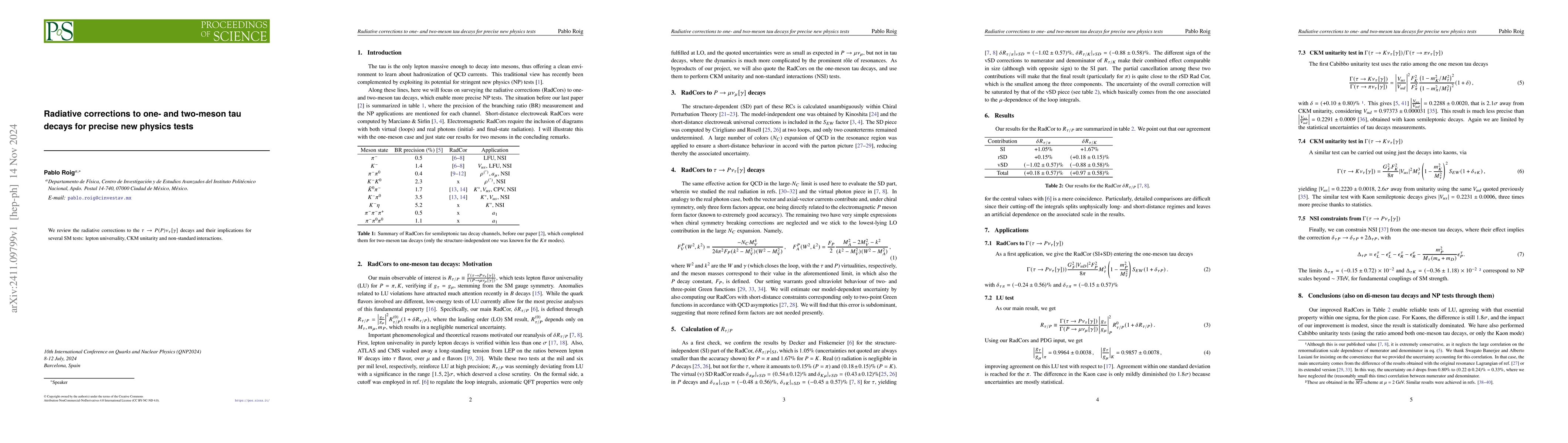 We review the radiative corrections to the $\tau \to P (P) \nu_\tau [\gamma]$ decays and their implications for several SM tests: lepton universality, CKM unitarity and non-standard interactions.