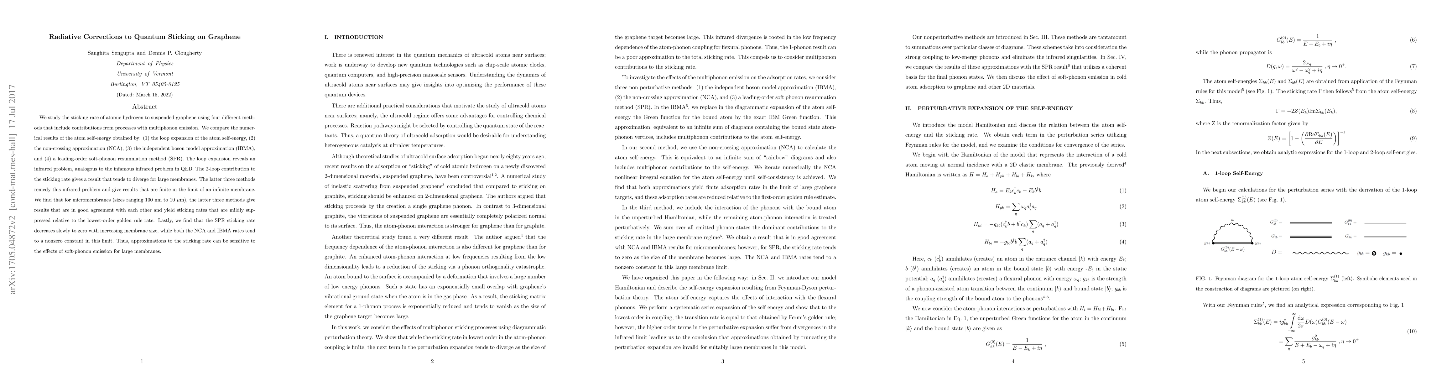 We study the sticking rate of atomic hydrogen to suspended graphene using four different methods that include contributions from processes with multiphonon emission. We compare the numerical results of the sticking rate obtained by: (1) the loop expansion of the atom self-energy, (2) the non-crossing approximation (NCA), (3) the independent boson model approximation (IBMA), and (4) a leading-order soft-phonon resummation method (SPR). The loop expansion reveals an infrared problem, analogous to the infamous infrared problem in QED. The 2-loop contribution to the sticking rate gives a result that tends to diverge for large membranes. The latter three methods remedy this infrared problem and give results that are finite in the limit of an infinite membrane. We find that for micromembranes (sizes ranging 100 nm to 10 $\mu$m), the latter three methods give results that are in good agreement with each other and yield sticking rates that are mildly suppressed relative to the lowest-order golden rule rate. Lastly, we find that the SPR sticking rate decreases slowly to zero with increasing membrane size, while both the NCA and IBMA rates tend to a nonzero constant in this limit. Thus, approximations to the sticking rate can be sensitive to the effects of soft-phonon emission for large membranes.