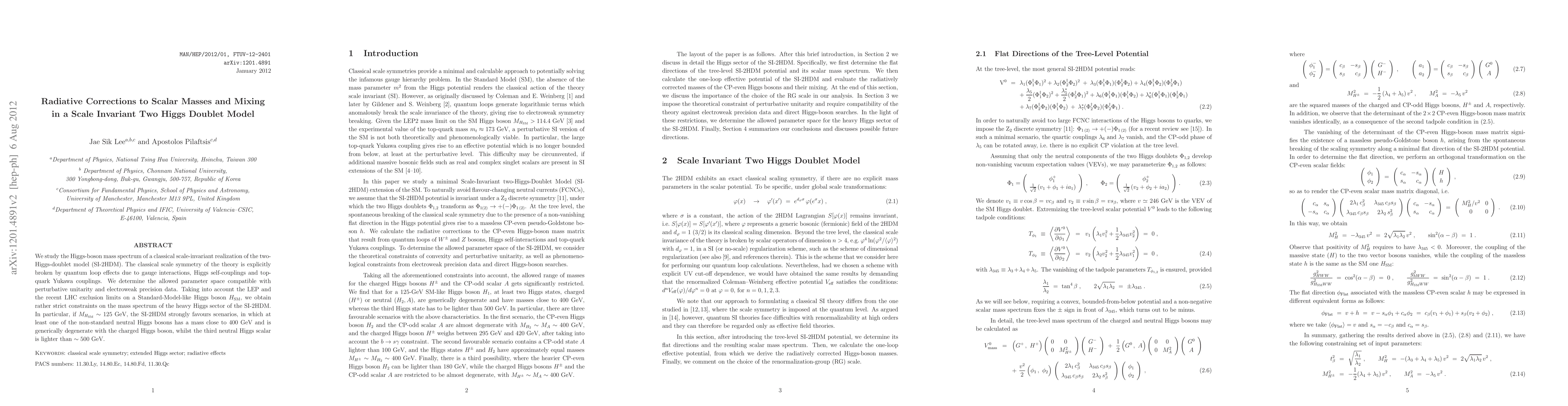 We study the Higgs-boson mass spectrum of a classical scale-invariant realization of the two-Higgs-doublet model (SI-2HDM). The classical scale symmetry of the theory is explicitly broken by quantum loop effects due to gauge interactions, Higgs self-couplings and top-quark Yukawa couplings. We determine the allowed parameter space compatible with perturbative unitarity and electroweak precision data. Taking into account the LEP and the recent LHC exclusion limits on a Standard-Model-like Higgs boson H_SM, we obtain rather strict constraints on the mass spectrum of the heavy Higgs sector of the SI-2HDM. In particular, if M_{H_SM} \sim 125 GeV, the SI-2HDM strongly favours scenarios, in which at least one of the non-standard neutral Higgs bosons has a mass close to 400 GeV and is generically degenerate with the charged Higgs boson, whilst the third neutral Higgs scalar is lighter than ~ 500 GeV.