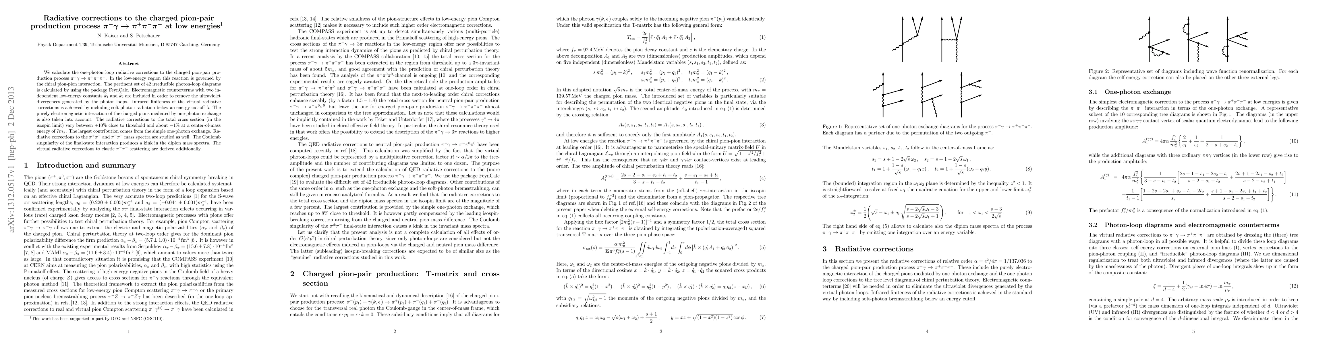 This paper calculates one-photon loop radiative corrections for the charged pion-pair production process $\pi^-\gamma\to\pi^+\pi^-\pi^-$ at low energies, employing a set of 42 irreducible photon-loop diagrams and electromagnetic counterterms to manage divergences. The corrections vary significantly, impacting the total cross section and dipion mass spectra, with the largest contribution from one-photon exchange.