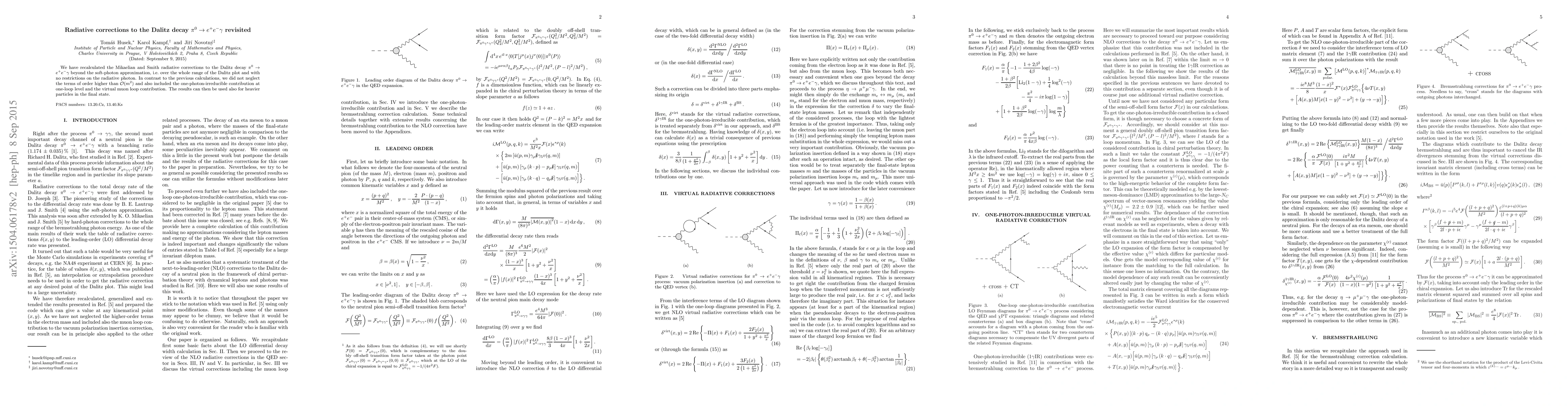 This paper recalculates radiative corrections to the Dalitz decay $\pi^0\to e^+e^-\gamma$ beyond the soft-photon approximation, including higher-order terms and the one-photon-irreducible contribution at one-loop level, providing results applicable to decays with heavier particles in the final state.