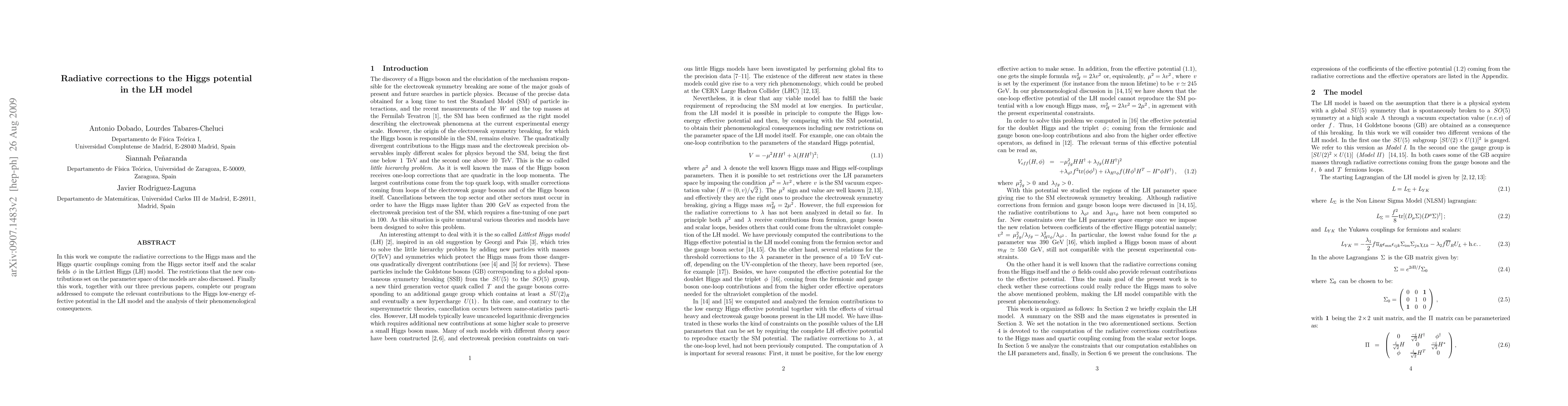 This paper calculates radiative corrections to the Higgs potential in the Littlest Higgs (LH) model, focusing on contributions from the Higgs sector and additional scalar fields. It discusses the implications of these corrections for the model's parameter space and completes a series of studies on the LH model's low-energy effective potential.