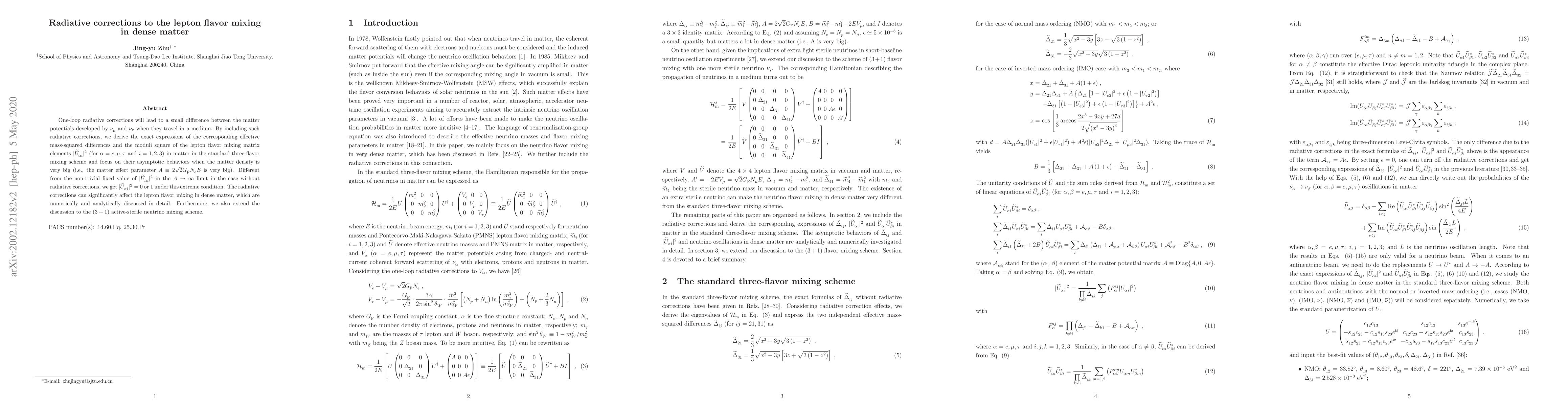 This paper investigates one-loop radiative corrections' impact on lepton flavor mixing in dense matter, deriving exact expressions for effective mass-squared differences and mixing matrix elements. It finds that these corrections lead to different asymptotic behaviors compared to scenarios without corrections, significantly affecting flavor mixing in dense matter.