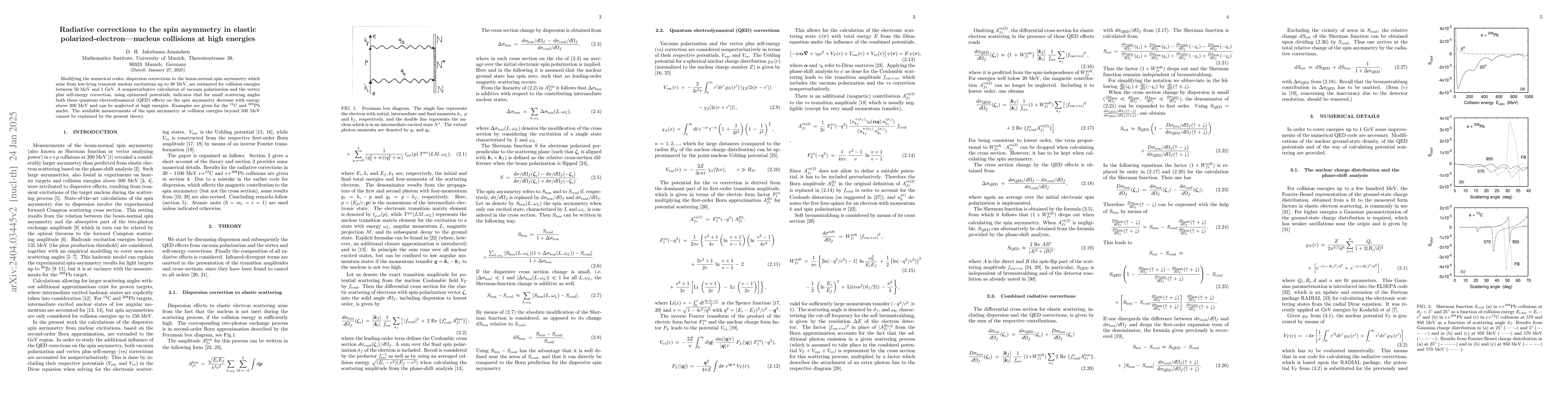 Improving the numerical precision, dispersion corrections to the beam-normal spin asymmetry which arise from the dominant nuclear excitations, are estimated up to a collision energy of 1 GeV. A nonperturbative calculation of vacuum polarization and the vertex plus self-energy correction, using optimized potentials, indicates that for small scattering angles both these quantum electrodynamical (QED) effects on the spin asymmetry decrease with energy above 200 MeV and can mostly be neglected at high energies. Examples are given for the 12C and 208Pb nuclei. While our results disagree with the measured high-energy spin asymmetry for 12C, they are able to explain the data on 208Pb near 1 GeV.