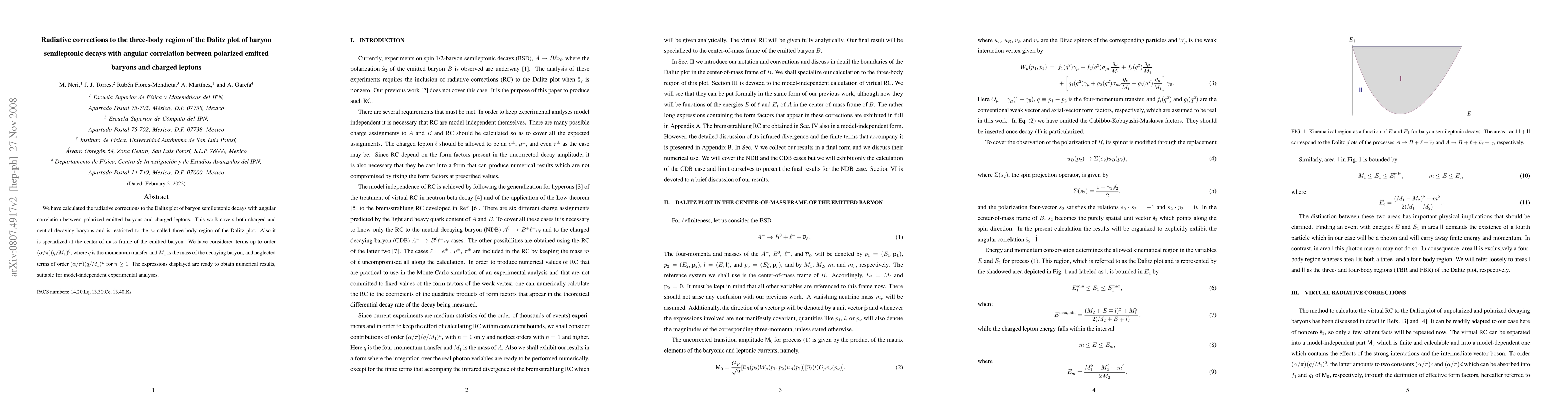 We have calculated the radiative corrections to the Dalitz plot of baryon semileptonic decays with angular correlation between polarized emitted baryons and charged leptons. This work covers both charged and neutral decaying baryons and is restricted to the so-called three-body region of the Dalitz plot. Also it is specialized at the center-of-mass frame of the emitted baryon. We have considered terms up to order (alpha/pi)(q/M_1)^0, where q is the momentum-transfer and M_1 is the mass of the decaying baryon, and neglected terms of order (alpha/pi)(q/M_1)^n$ for n >= 1. The expressions displayed are ready to obtain numerical results, suitable for model-independent experimental analyses.