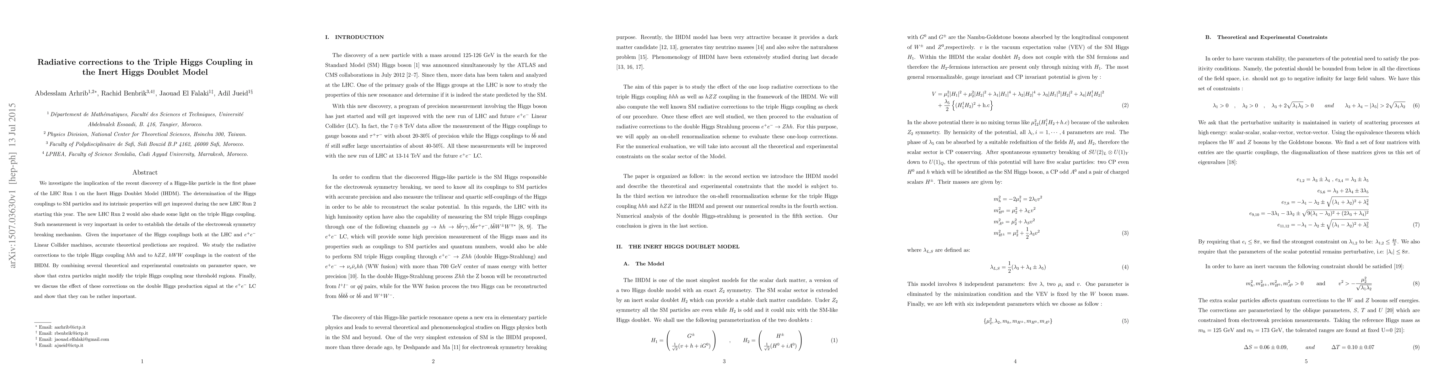 We investigate the implication of the recent discovery of a Higgs-like particle in the first phase of the LHC Run 1 on the Inert Higgs Doublet Model (IHDM). The determination of the Higgs couplings to SM particles and its intrinsic properties will get improved during the new LHC Run 2 starting this year. The new LHC Run 2 would also shade some light on the triple Higgs coupling. Such measurement is very important in order to establish the details of the electroweak symmetry breaking mechanism. Given the importance of the Higgs couplings both at the LHC and $e^+e^-$ Linear Collider machines, accurate theoretical predictions are required. We study the radiative corrections to the triple Higgs coupling $hhh$ and to $hZZ$, $hWW$ couplings in the context of the IHDM. By combining several theoretical and experimental constraints on parameter space, we show that extra particles might modify the triple Higgs coupling near threshold regions. Finally, we discuss the effect of these corrections on the double Higgs production signal at the $e^+e^-$ LC and show that they can be rather important.