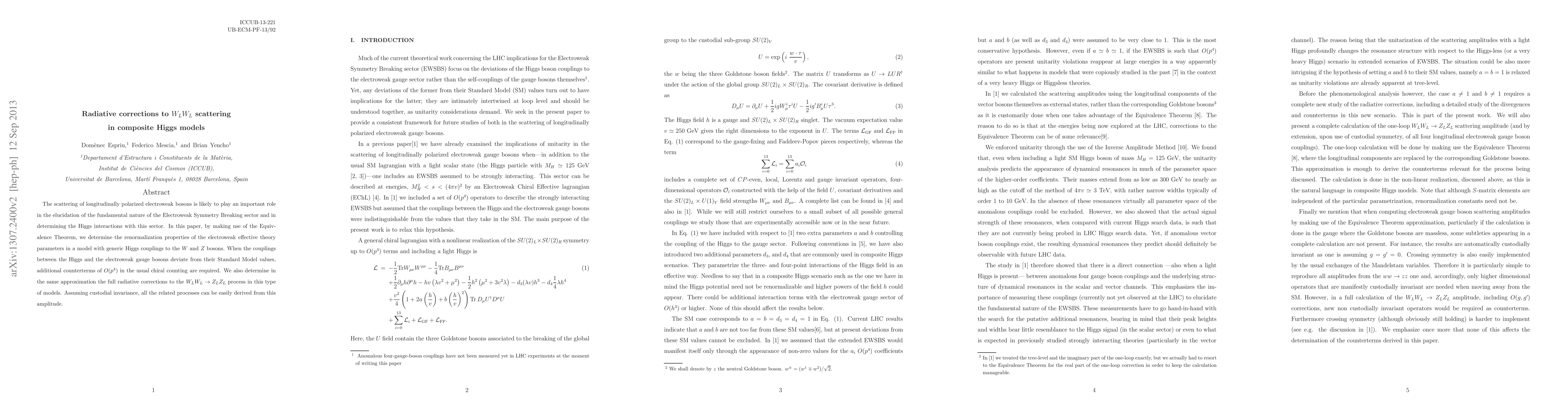 The scattering of longitudinally polarized electroweak bosons is likely to play an important role in the elucidation of the fundamental nature of the Electroweak Symmetry Breaking sector and in determining the Higgs interactions with this sector. In this paper, by making use of the Equivalence Theorem, we determine the renormalization properties of the electroweak effective theory parameters in a model with generic Higgs couplings to the W and Z bosons. When the couplings between the Higgs and the electroweak gauge bosons deviate from their Standard Model values, additional counterterms of O(p^4) in the usual chiral counting are required. We also determine in the same approximation the full radiative corrections to the WL WL->ZL ZL process in this type of models. Assuming custodial invariance, all the related processes can be easily derived from this amplitude.