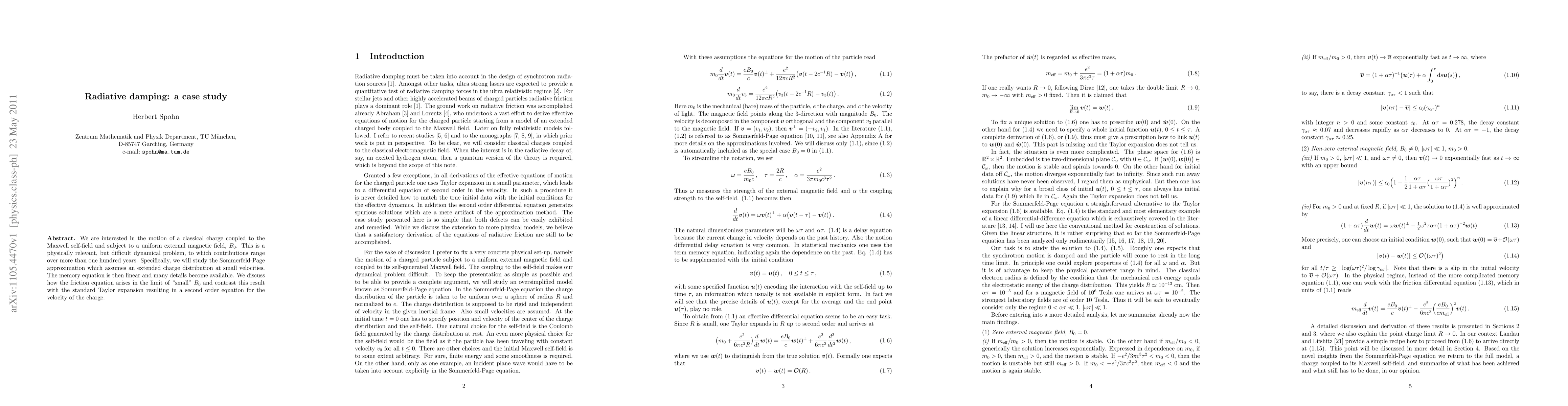 We are interested in the motion of a classical charge coupled to the Maxwell self-field and subject to a uniform external magnetic field, B. This is a physically relevant, but difficult dynamical problem, to which contributions range over more than one hundred years. Specifically, we will study the Sommerfeld-Page approximation which assumes an extended charge distribution at small velocities. The memory equation is then linear and many details become available. We discuss how the friction equation arises in the limit of "small" B and contrast this result with the standard Taylor expansion resulting in a second order equation for the velocity of the charge.