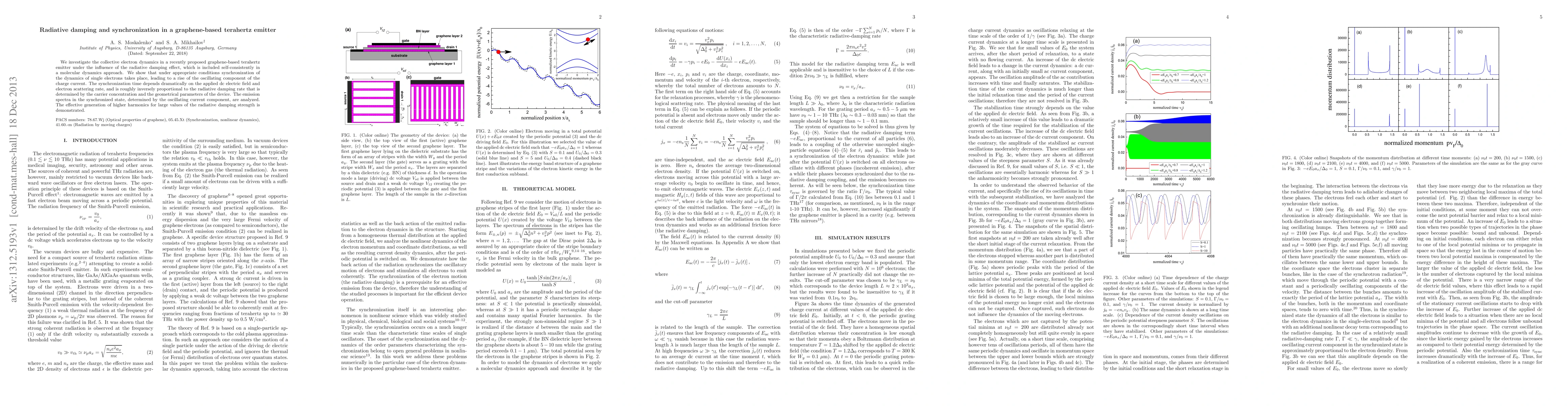 We investigate the collective electron dynamics in a recently proposed graphene-based terahertz emitter under the influence of the radiative damping effect, which is included self-consistently in a molecular dynamics approach. We show that under appropriate conditions synchronization of the dynamics of single electrons takes place, leading to a rise of the oscillating component of the charge current. The synchronization time depends dramatically on the applied dc electric field and electron scattering rate, and is roughly inversely proportional to the radiative damping rate that is determined by the carrier concentration and the geometrical parameters of the device. The emission spectra in the synchronized state, determined by the oscillating current component, are analyzed. The effective generation of higher harmonics for large values of the radiative damping strength is demonstrated.