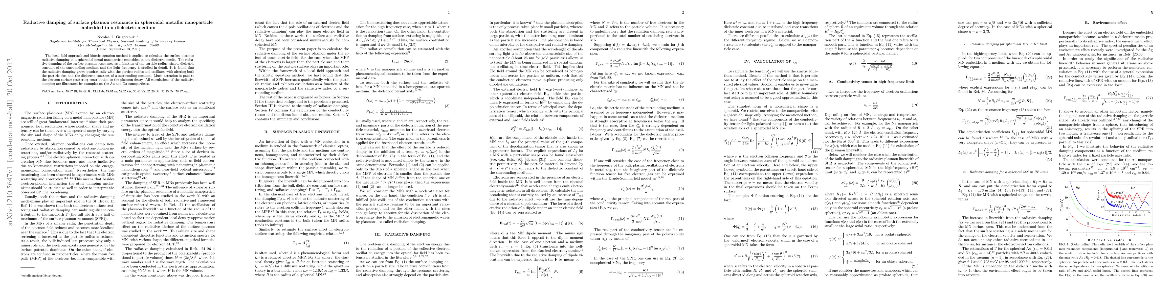 This paper investigates the radiative damping of surface plasmon resonance in spheroidal metallic nanoparticles using the local field approach and kinetic equation method. The study reveals that radiative damping grows quadratically with particle radius and oscillates with changes in particle size and surrounding medium's dielectric constant, with significant electron surface-scattering contributions to plasmon decay, demonstrated through examples of Au and Na nanoparticles.