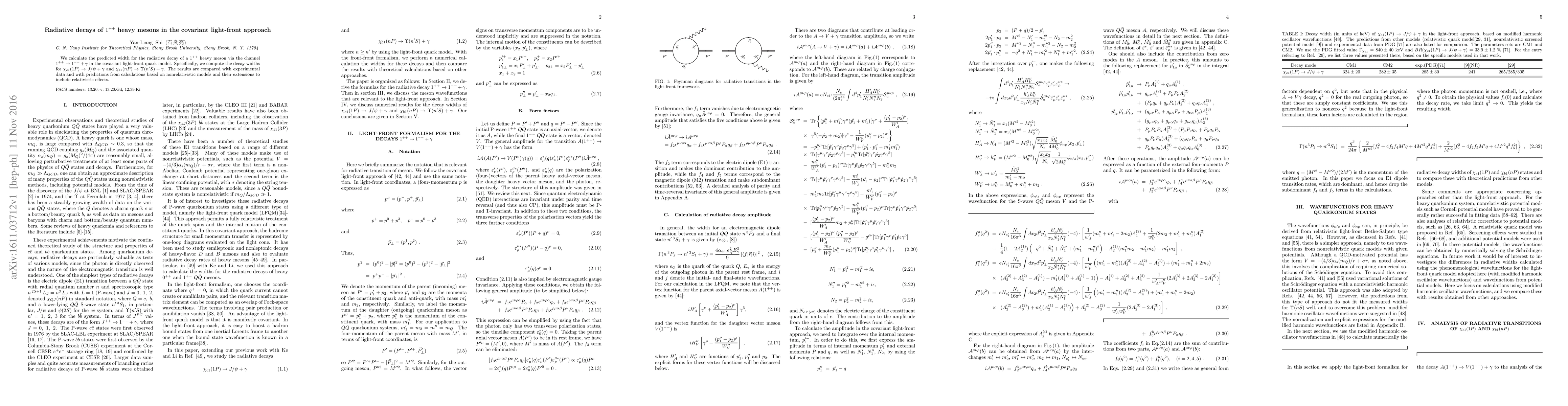 We calculate the predicted width for the radiative decay of a $1^{++}$ heavy meson via the channel $1^{++} \to 1^{--} +\gamma$ in the covariant light-front quark model. Specifically, we compute the decay widths for $\chi_{c1}(1P) \to J/\psi + \gamma$ and $\chi_{b1}(nP) \to \Upsilon(n'S) + \gamma$. The results are compared with experimental data and with predictions from calculations based on nonrelativistic models and their extensions to include relativistic effects.