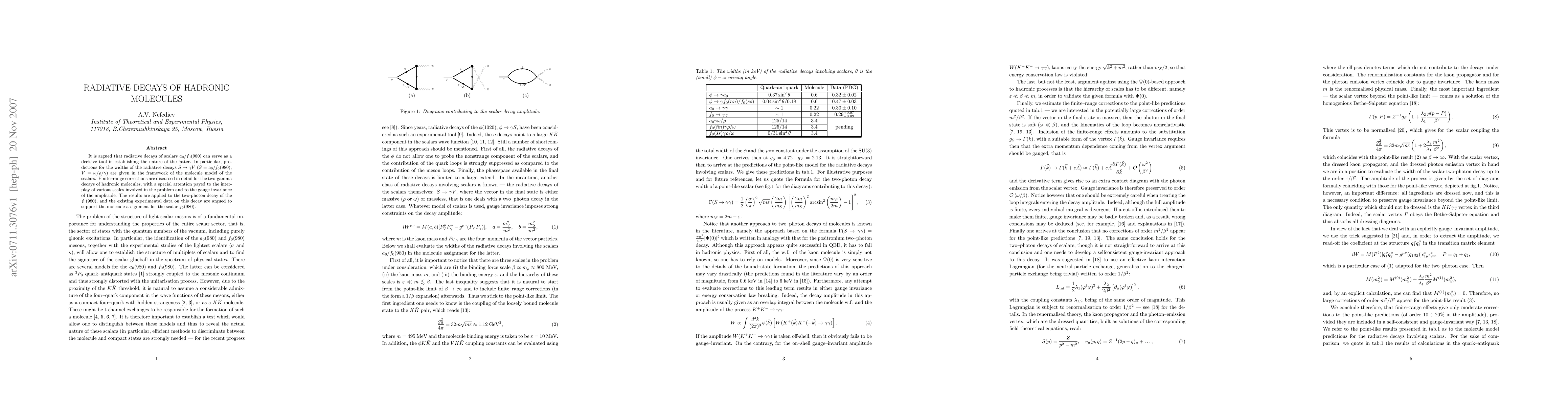 It is argued that radiative decays of scalars a0/f0(980) can serve as a decisive tool in establishing the nature of the latter. In particular, predictions for the widths of the radiative decays S->gamma V (S=a0/f0(980), V=omega/rho/gamma) are given in the framework of the molecule model of the scalars. Finite-range corrections are discussed in detail for the two-gamma decays of hadronic molecules, with a special attention payed to the interplay of various scales involved in the problem and to the gauge invariance of the amplitude. The results are applied to the two-photon decay of the f0(980), and the existing experimental data on this decay are argued to support the molecule assignment for the scalar f0(980).