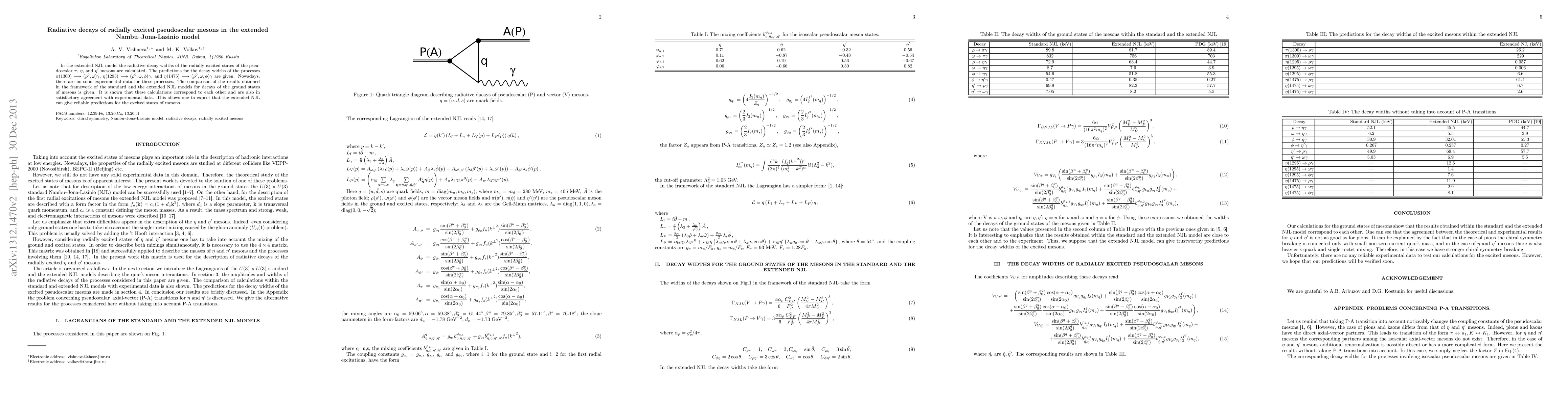 In the extended NJL model the radiative decay widths of the radially excited states of the pseudoscalar $\pi$, $\eta$, and $\eta'$ mesons are calculated. The predictions for the decay widths of the processes $\pi(1300)\longrightarrow(\rho^0,\omega)\gamma$, $\eta(1295)\longrightarrow(\rho^0,\omega,\phi)\gamma$, and $\eta(1475)\longrightarrow(\rho^0,\omega,\phi)\gamma$ are given. Nowadays, there are no solid experimental data for these processes. The comparison of the results obtained in the framework of the standard and the extended NJL models for decays of the ground states of mesons is given. It is shown that these calculations correspond to each other and are also in satisfactory agreement with experimental data. This allows one to expect that the extended NJL can give reliable predictions for the excited states of mesons.