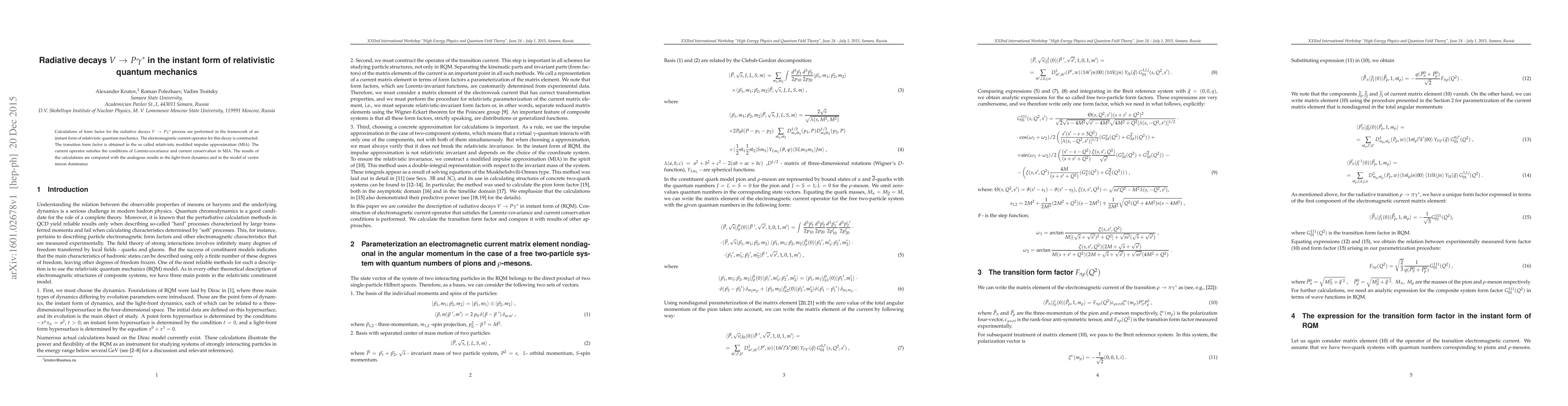 Calculations of form factor for the radiative decays $V\rightarrow P\gamma^{*}$ process are performed in the framework of an instant form of relativistic quantum mechanics. The electromagnetic current operator for this decay is constructed. The transition form factor is obtained in the so called relativistic modified impulse approximation (MIA). The current operator satisfies the conditions of Lorentz-covariance and current conservation in MIA. The results of the calculations are compared with the analogous results in the light-front dynamics and in the model of vector meson dominance