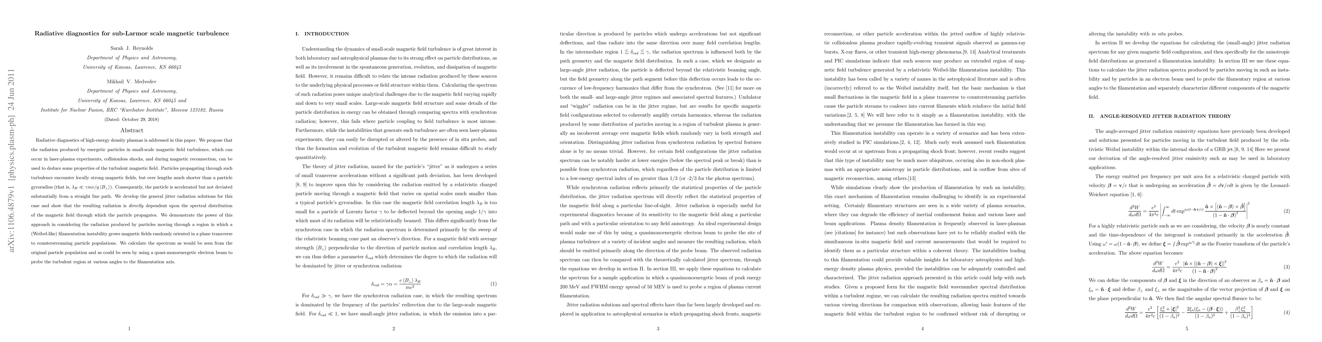 Radiative diagnostics of high-energy density plasmas is addressed in this paper. We propose that the radiation produced by energetic particles in small-scale magnetic field turbulence, which can occur in laser-plasma experiments, collisionless shocks, and during magnetic reconnection, can be used to deduce some properties of the turbulent magnetic field. Particles propagating through such turbulence encounter locally strong magnetic fields, but over lengths much shorter than a particle gyroradius. Consequently, the particle is accelerated but not deviated substantially from a straight line path. We develop the general jitter radiation solutions for this case and show that the resulting radiation is directly dependent upon the spectral distribution of the magnetic field through which the particle propagates. We demonstrate the power of this approach in considering the radiation produced by particles moving through a region in which a (Weibel-like) filamentation instability grows magnetic fields randomly oriented in a plane transverse to counterstreaming particle populations. We calculate the spectrum as would be seen from the original particle population and as could be seen by using a quasi-monoenergetic electron beam to probe the turbulent region at various angles to the filamentation axis.