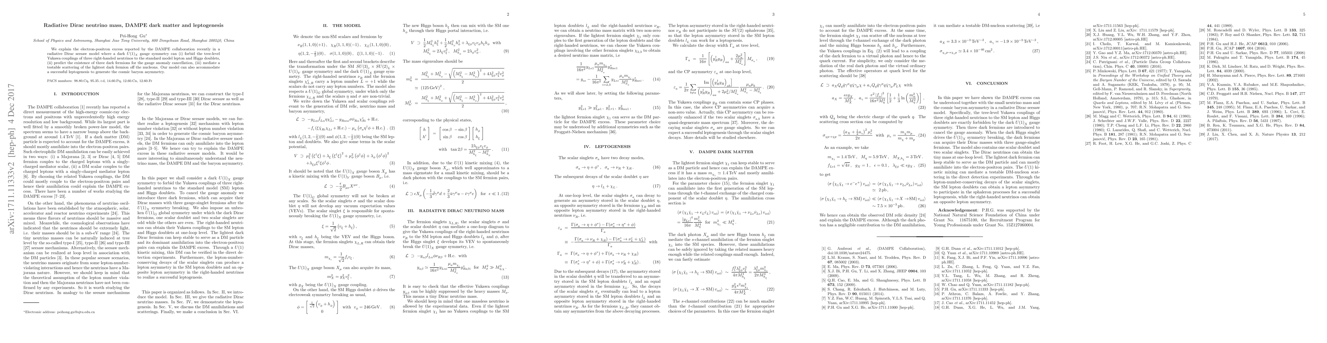 We explain the electron-positron excess reported by the DAMPE collaboration recently in a radiative Dirac seesaw model where a dark $U(1)_X$ gauge symmetry can (i) forbid the tree-level Yukawa couplings of three right-handed neutrinos to the standard model lepton and Higgs doublets, (ii) predict the existence of three dark fermions for the gauge anomaly cancellation, (iii) mediate a testable scattering of the lightest dark fermion off the nucleons. Our model can also accommodate a successful leptogenesis to generate the cosmic baryon asymmetry.