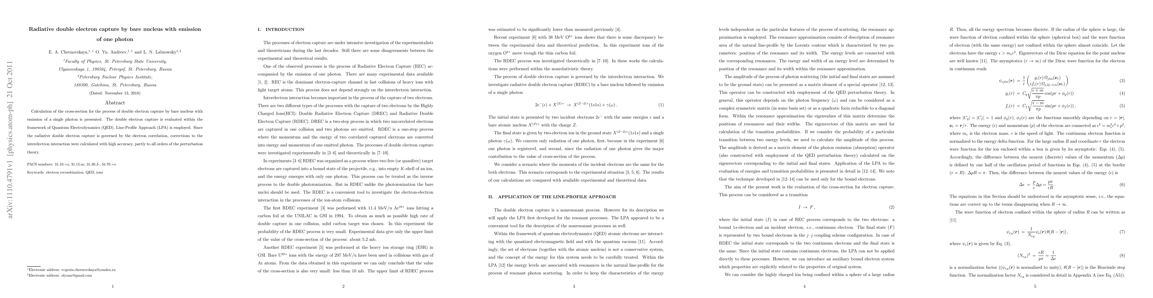Calculation of the cross-section for the process of double electron capture by bare nucleus with emission of a single photon is presented. The double electron capture is evaluated within the framework of Quantum Electrodynamics (QED). Line-Profile Approach (LPA) is employed. Since the radiative double electron capture is governed by the electron correlation, corrections to the interelectron interaction were calculated with high accuracy, partly to all orders of the perturbation theory.