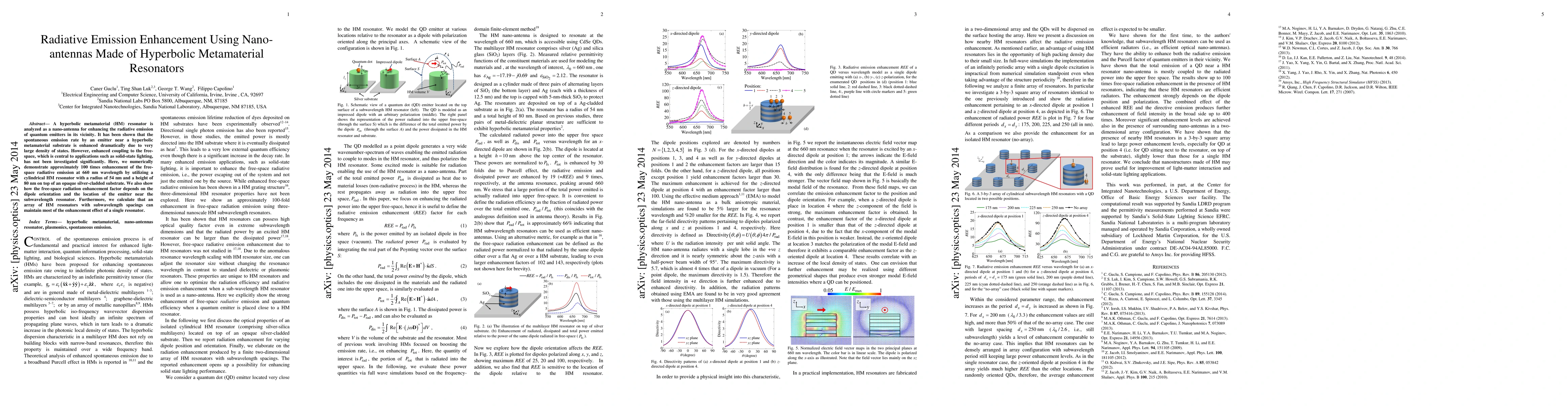 A hyperbolic metamaterial (HM) resonator is analyzed as a nano-antenna for enhancing the radiative emission of quantum emitters in its vicinity. It has been shown that the spontaneous emission rate by an emitter near a hyperbolic metamaterial substrate is enhanced dramatically due to very large density of states. However, enhanced coupling to the free-space, which is central to applications such as solid-state lighting, has not been investigated significantly. Here, we numerically demonstrate approximately 100 times enhancement of the free-space radiative emission at 660 nm wavelength by utilizing a cylindrical HM resonator with a radius of 54 nm and a height of 80 nm on top of an opaque silver-cladded substrate. We also show how the free-space radiation enhancement factor depends on the dipole orientation and the location of the emitter near the subwavelength resonator. Furthermore, we calculate that an array of HM resonators with subwavelength spacings can maintain most of the enhancement effect of a single resonator.