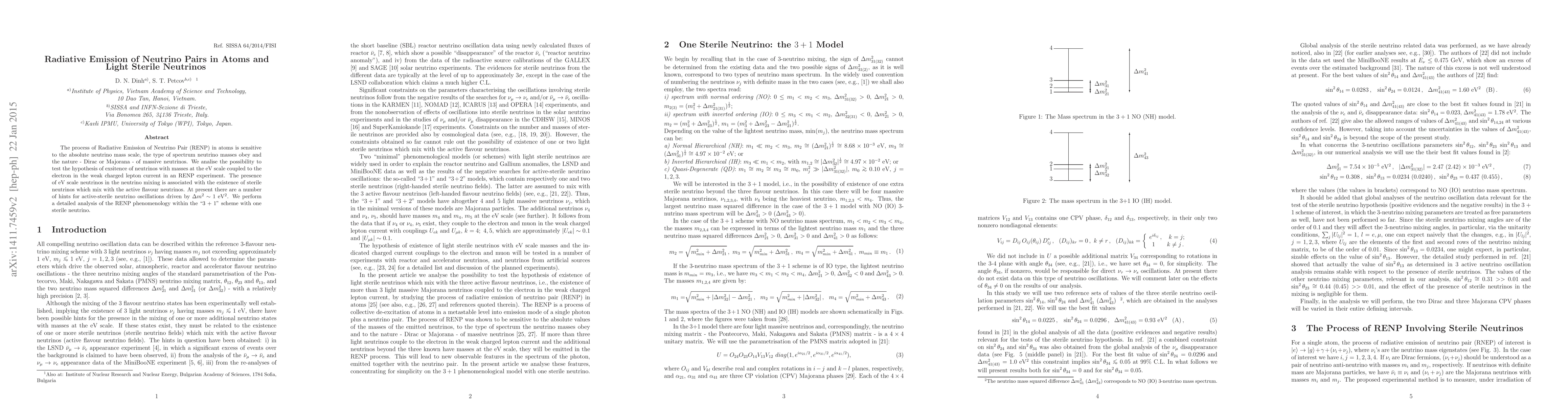 This paper investigates the Radiative Emission of Neutrino Pairs (RENP) in atoms to probe the neutrino mass scale, spectrum, and nature, focusing on the potential detection of eV-scale neutrinos linked to light sterile neutrinos. The study explores the "3 + 1" scheme with one sterile neutrino to analyze the phenomenology of RENP and its implications for active-sterile neutrino oscillations.