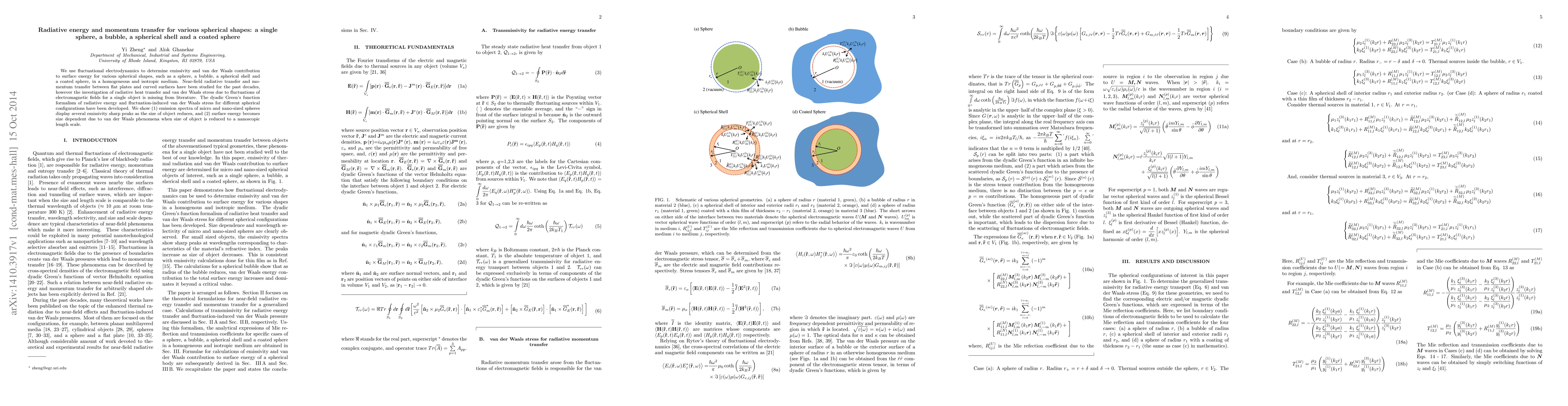 We use fluctuational electrodynamics to determine emissivity and van der Waals contribution to surface energy for various spherical shapes, such as a sphere, a bubble, a spherical shell and a coated sphere, in a homogeneous and isotropic medium. Near-field radiative transfer and momentum transfer between flat plates and curved surfaces have been studied for the past decades, however the investigation of radiative heat transfer and van der Waals stress due to fluctuations of electromagnetic fields for a single object is missing from literature. The dyadic Green's function formalism of radiative energy and fluctuation-induced van der Waals stress for different spherical configurations have been developed. We show (1) emission spectra of micro and nano-sized spheres display several emissivity sharp peaks as the size of object reduces, and (2) surface energy becomes size dependent due to van der Waals phenomena when size of object is reduced to a nanoscopic length scale.
