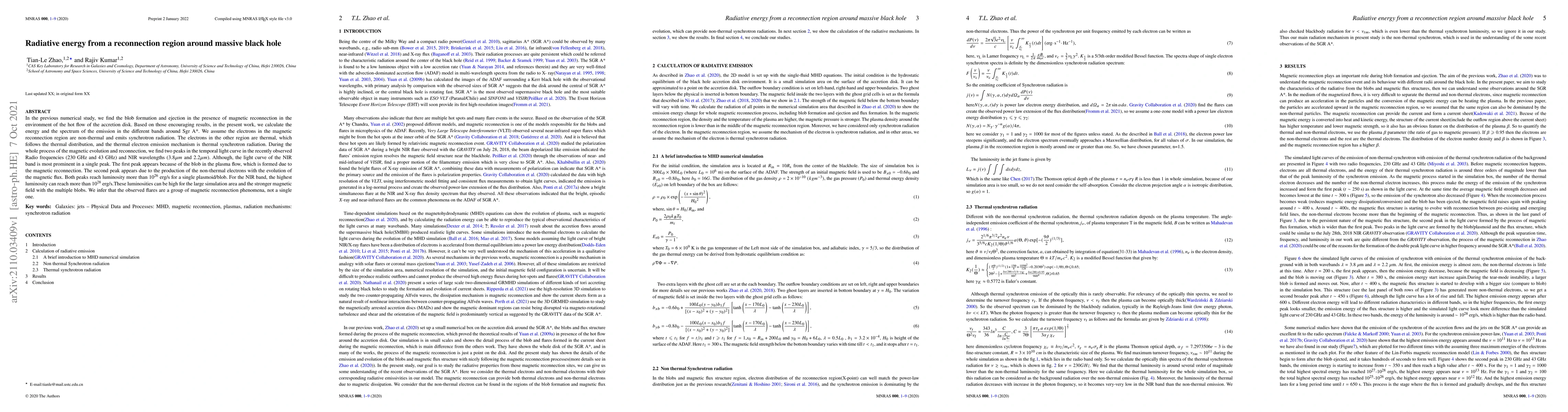 In the previous numerical study, we find the blob formation and ejection in the presence of magnetic reconnection in the environment of the hot flow of the accretion disk. Based on those encouraging results, in the present work, we calculate the energy and the spectrum of the emission in the different bands around Sgr A*. We assume the electrons in the magnetic reconnection region are non-thermal and emits synchrotron radiation. The electrons in the other region are thermal, which follows the thermal distribution, and the thermal electron emission mechanism is thermal synchrotron radiation. During the whole process of the magnetic evolution and reconnection, we find two peaks in the temporal light curve in the recently observed Radio frequencies (230 GHz and 43 GHz) and NIR wavelengths. Although, the light curve of the NIR band is most prominent in a single peak. The first peak appears because of the blob in the plasma flow, which is formed due to the magnetic reconnection. The second peak appears due to the production of the non-thermal electrons with the evolution of the magnetic flux. Both peaks reach luminosity more than 1026 erg/s for a single plasmoid/blob. For the NIR band, the highest luminosity can reach more than 1028 erg/s. These luminosities can be high for the large simulation area and the stronger magnetic field with the multiple blobs. We infer that the observed flares are a group of magnetic reconnection phenomena, not a single one.