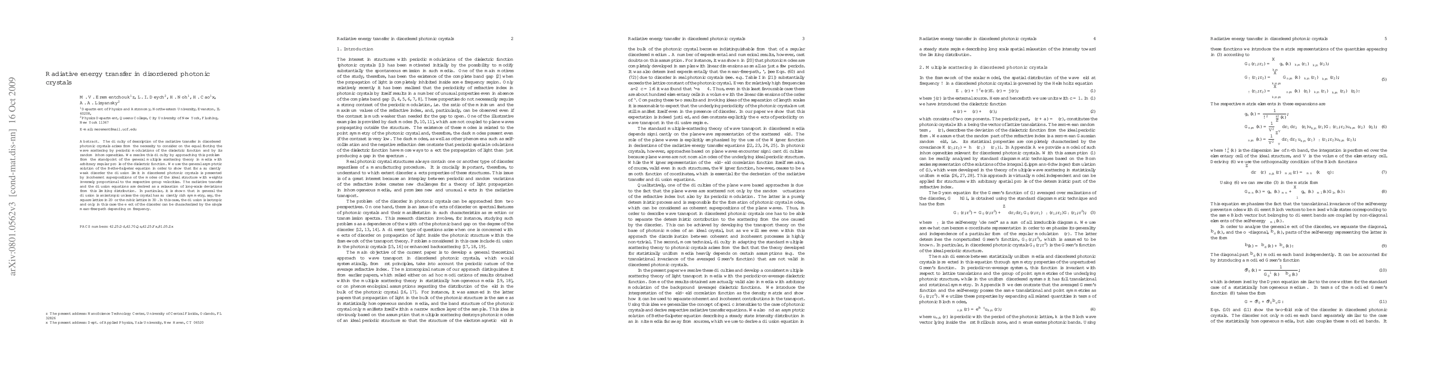 The difficulty of description of the radiative transfer in disordered photonic crystals arises from the necessity to consider on the equal footing the wave scattering by periodic modulations of the dielectric function and by its random inhomogeneities. We resolve this difficulty by approaching this problem from the standpoint of the general multiple scattering theory in media with arbitrary regular profile of the dielectric function. We use the general asymptotic solution of the Bethe-Salpeter equation in order to show that for a sufficiently weak disorder the diffusion limit in disordered photonic crystals is presented by incoherent superpositions of the modes of the ideal structure with weights inversely proportional to the respective group velocities. The radiative transfer and the diffusion equations are derived as a relaxation of long-scale deviations from this limiting distribution. In particular, it is shown that in general the diffusion is anisotropic unless the crystal has sufficiently rich symmetry, say, the square lattice in 2D or the cubic lattice in 3D. In this case, the diffusion is isotropic and only in this case the effect of the disorder can be characterized by the single mean-free-path depending on frequency.