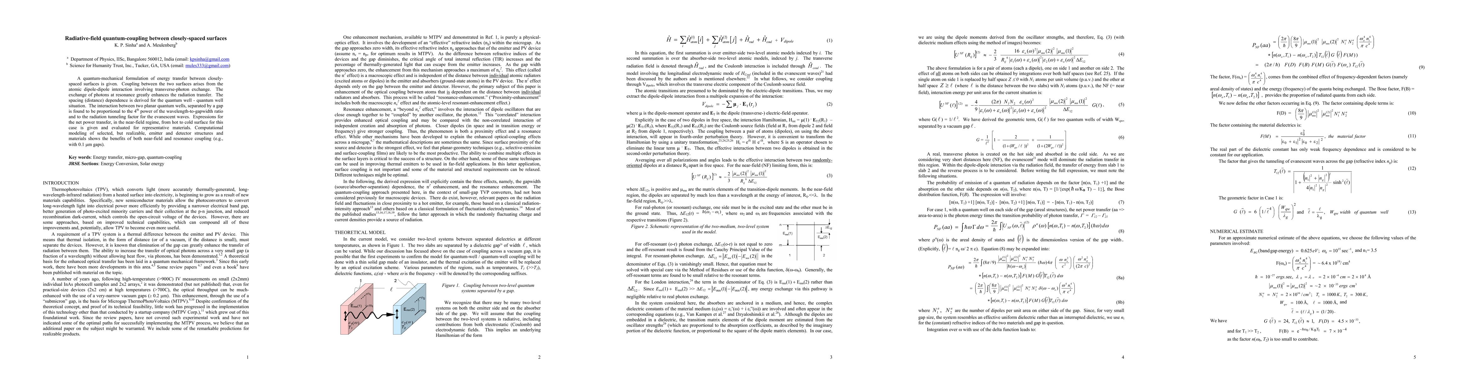 This paper presents a quantum-mechanical model for energy transfer between closely-spaced surfaces via dipole-dipole interactions and photon exchange, showing that resonance enhances radiation transfer significantly. The interaction strength between quantum wells is proportional to the fourth power of the wavelength-to-gap ratio and the radiation tunneling factor, with computational modeling demonstrating the benefits of near-field and resonance coupling.
