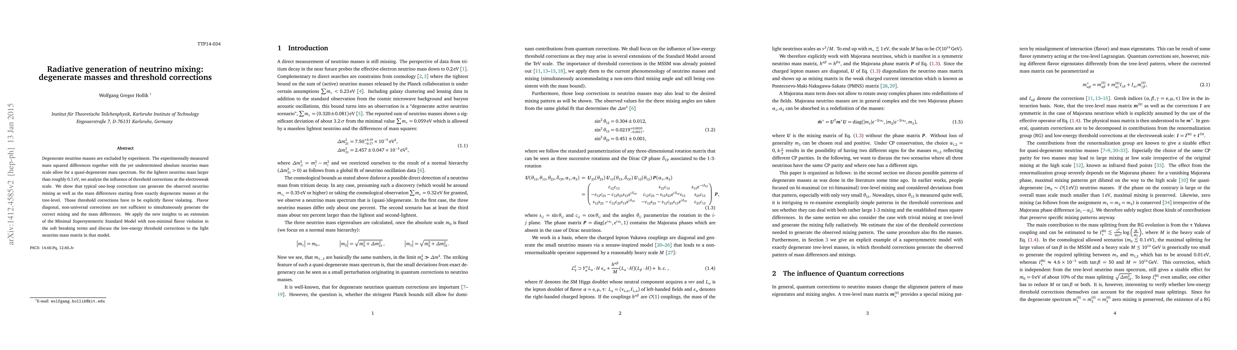 Degenerate neutrino masses are excluded by experiment. The experimentally measured mass squared differences together with the yet undetermined absolute neutrino mass scale allow for a quasi-degenerate mass spectrum. For the lightest neutrino mass larger than roughly 0.1 eV, we analyse the influence of threshold corrections at the electroweak scale. We show that typical one-loop corrections can generate the observed neutrino mixing as well as the mass differences starting from exactly degenerate masses at the tree-level. Those threshold corrections have to be explicitly flavour violating. Flavour diagonal, non-universal corrections are not sufficient to simultaneously generate the correct mixing and the mass differences. We apply the new insights to an extension of the Minimal Supersymmetric Standard Model with non-minimal flavour violation in the soft breaking terms and discuss the low-energy threshold corrections to the light neutrino mass matrix in that model.